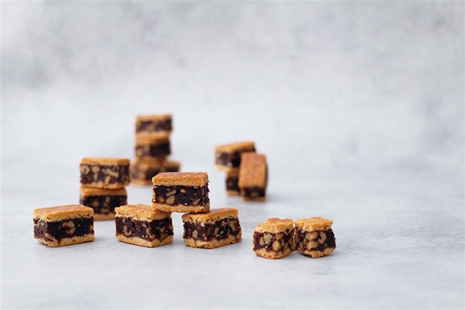 サクサクのクッキーにつぶころあんこ・くるみ・生キャラメルをはさみました。2個セットで1個には抹茶パウダーをかけています。つぶころあんこは温かく、ここでしか食べられないまりあんじゅになっています!