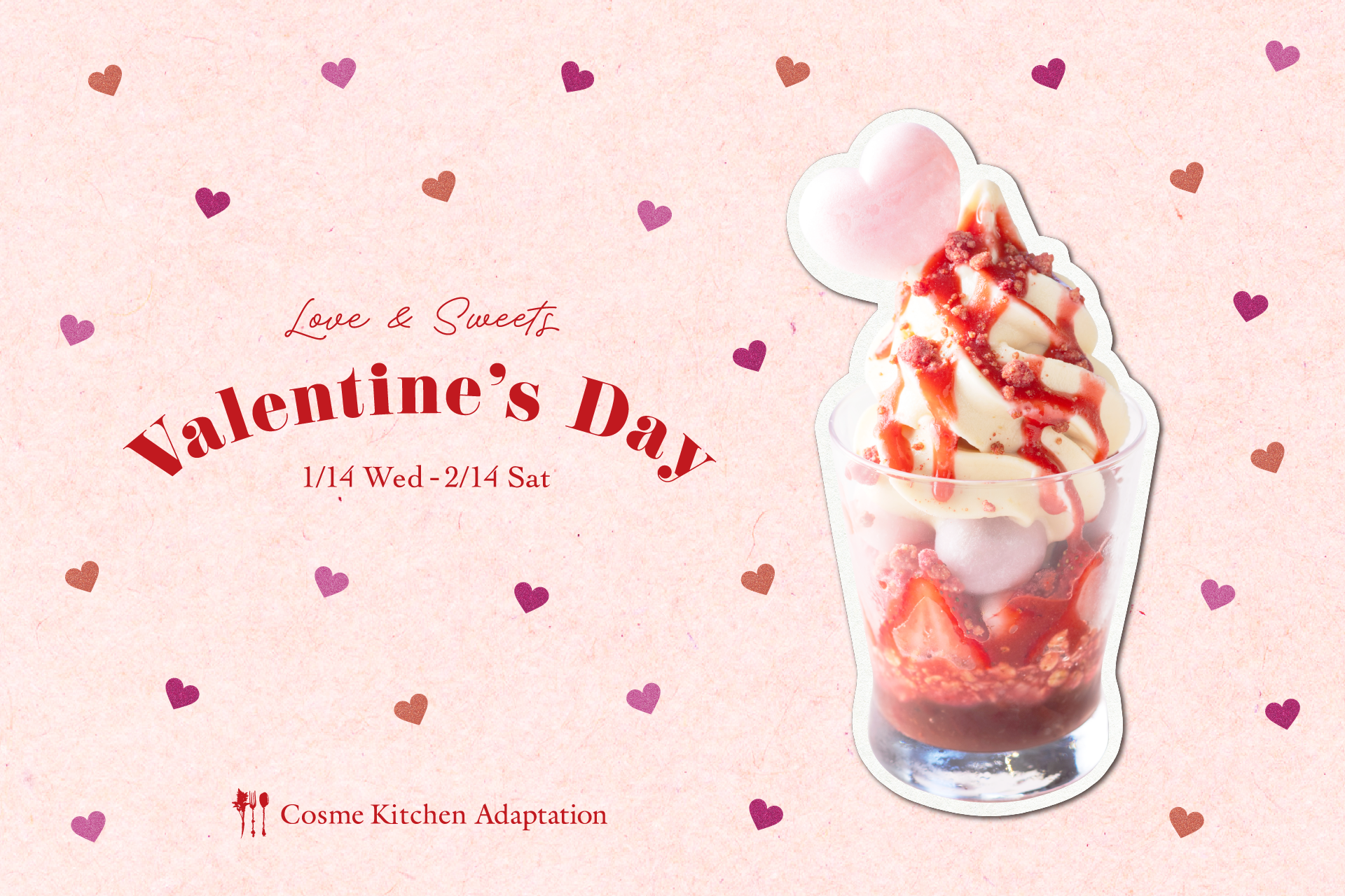 株式会社マッシュフードラボ(代表取締役社長:金澤一広、本社:東京都千代田区)が運営するCosme Kitchen Adaptation 阪神梅田本店では、 阪神梅田本店(大阪市北区)の毎年恒例イベント 「阪神のバレンタイン2026」に合わせたバレンタイン限定メニュー『STRAWBERRY LOVE PARFAIT(いちごのラブパフェ)』を2026年1月14日(水)より提供開始いたします。