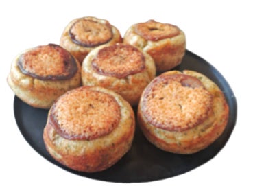 宮若市の農家夫婦との出会いから生まれた、見た目が「まるで椎茸」なユニークなパンです。鮮度抜群の無農薬椎茸を主役に、地黄卵の自家製明太バターマヨと国産あおさを合わせ、オリーブオイルで香ばしい「揚げ焼き」に仕上げました。イタリア料理から着想を得つつ、畑の緑をイメージした生地で椎茸そのもののフォルムを再現。生産者の想いを形にした、見て楽しく食べて美味しい地産地消の自信作です。