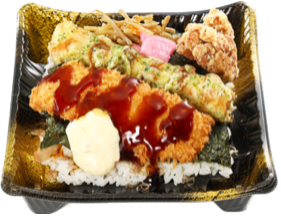「自社製・出来立て」にこだわったワンランク上の海苔弁当が登場。自社で手切りからパン粉付けしているふっくら白身フライ、日本唐揚協会で金賞を受賞した唐揚げ、ちくわの磯部揚げを詰め合わせた容器溢れるボリュームながら特製ソースや出汁醤油が食欲をそそる大満足の一品です。