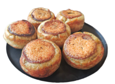宮若市の農家夫婦との出会いから生まれた、見た目が「まるで椎茸」なユニークなパンです。鮮度抜群の無農薬椎茸を主役に、地黄卵の自家製明太バターマヨと国産あおさを合わせ、オリーブオイルで香ばしい「揚げ焼き」に仕上げました。イタリア料理から着想を得つつ、畑の緑をイメージした生地で椎茸そのもののフォルムを再現。生産者の想いを形にした、見て楽しく食べて美味しい地産地消の自信作です。