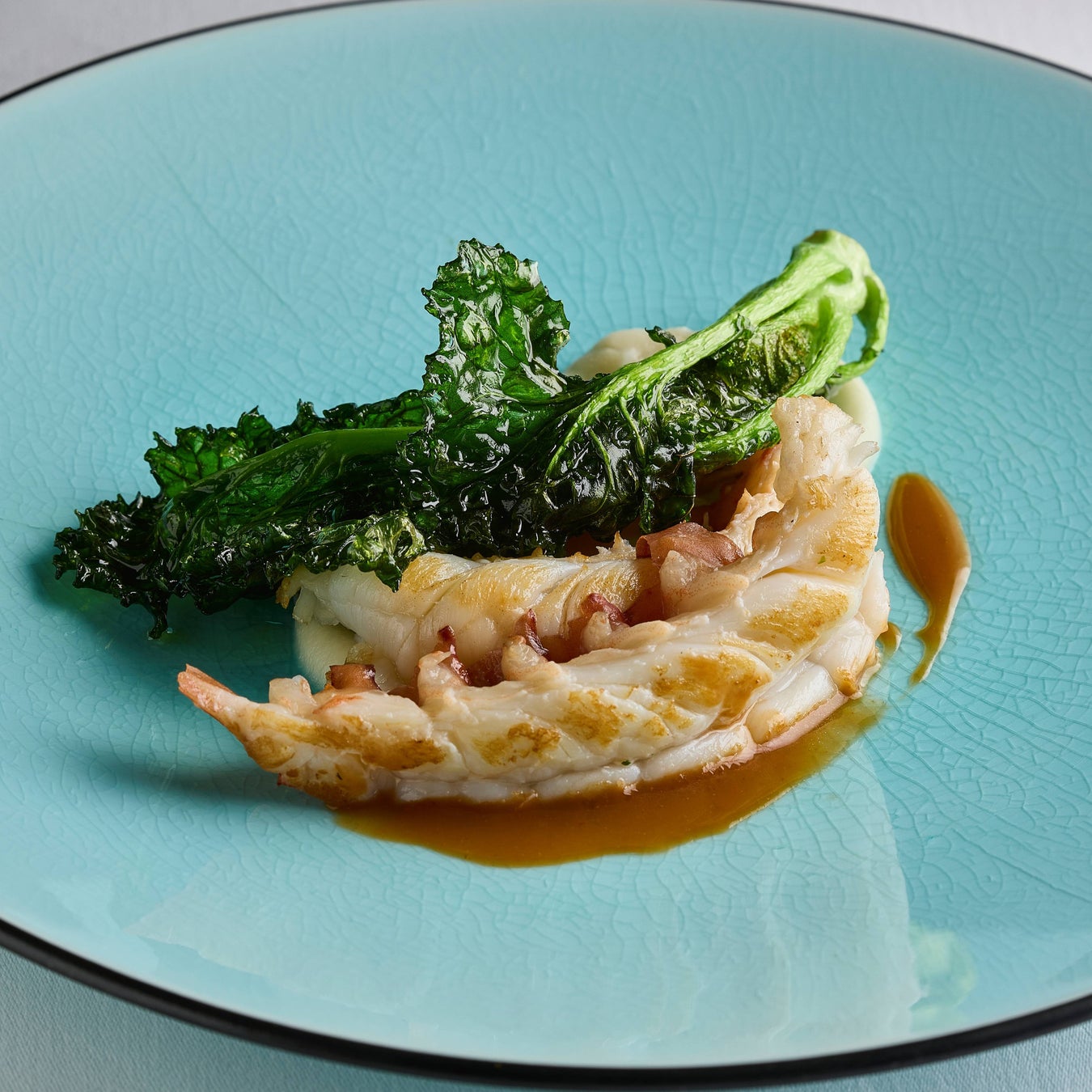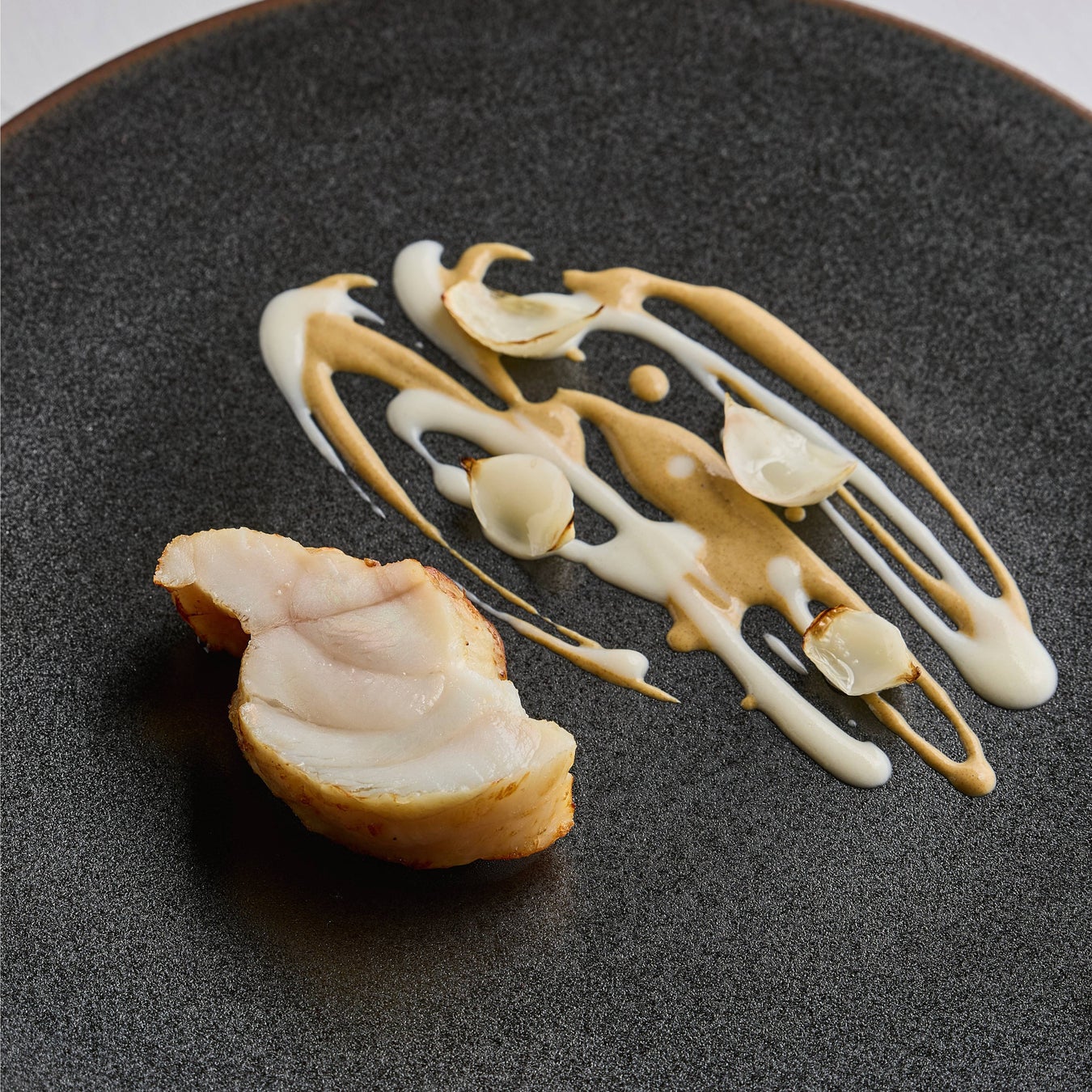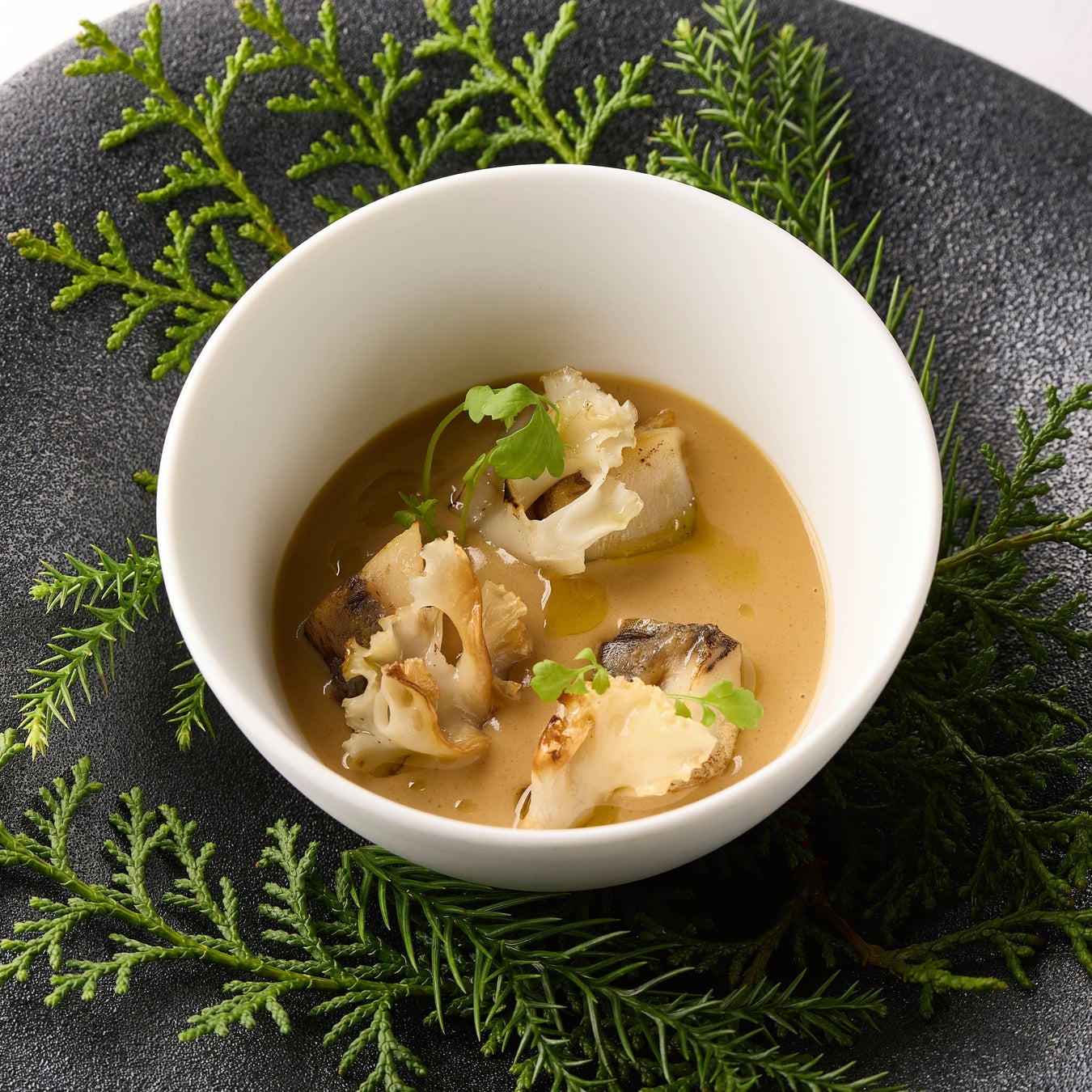 岐阜の清流が育んだ「鮎」を、最も美味しい時期に香りを閉じ込め、一年を通して味わえる濃厚なピューレに仕立てました。 香ばしく炙った旬の鮮魚に、鮎独特のほろ苦さと香り、サワークリームの酸味、マッシュルームの旨味が重なる一皿。季節ごとに変わる鮮魚と、変わらぬ岐阜の味の融合をお楽しみください。