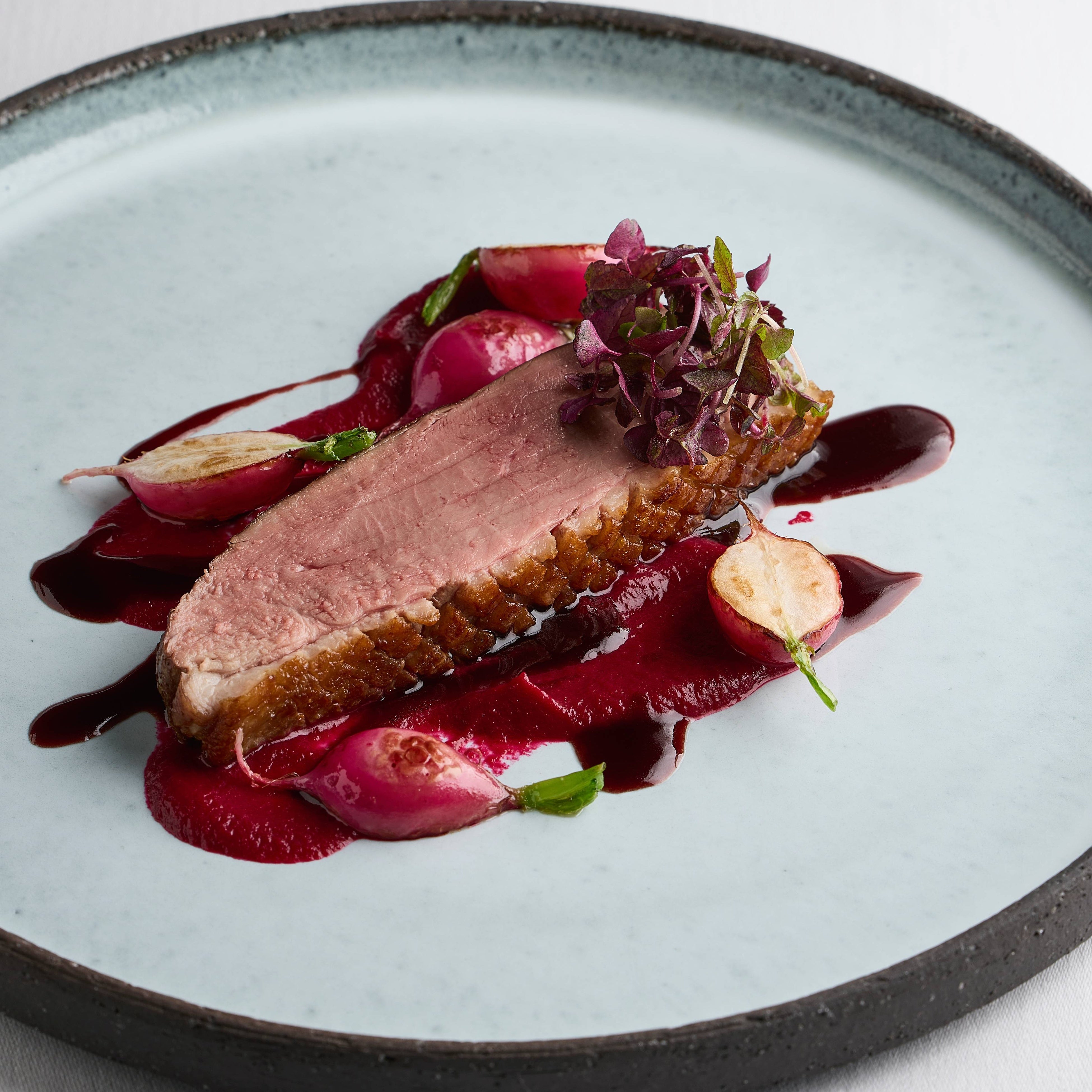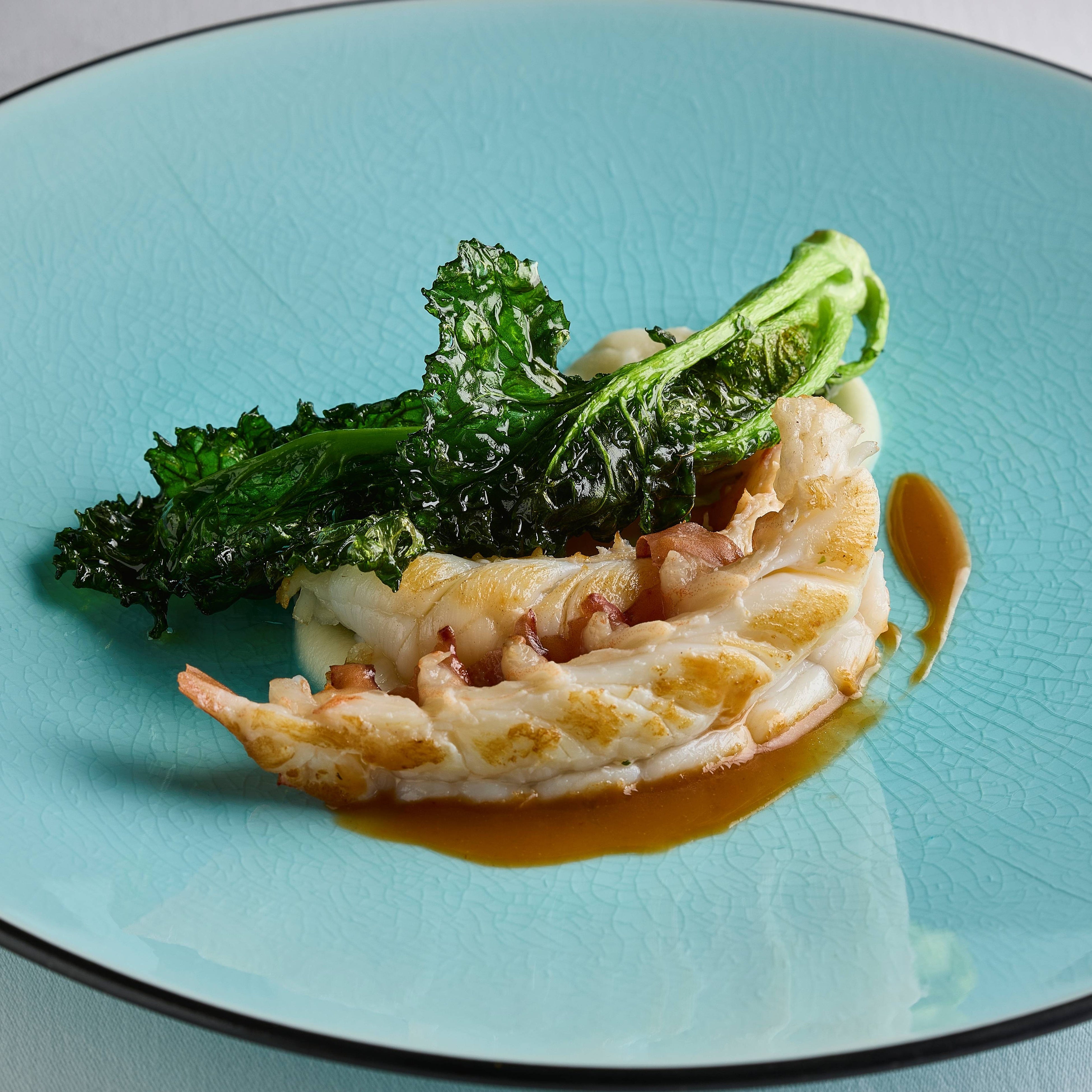 岐阜の清流が育んだ「鮎」を、最も美味しい時期に香りを閉じ込め、一年を通して味わえる濃厚なピューレに仕立てました。 香ばしく炙った旬の鮮魚に、鮎独特のほろ苦さと香り、サワークリームの酸味、マッシュルームの旨味が重なる一皿。季節ごとに変わる鮮魚と、変わらぬ岐阜の味の融合をお楽しみください。