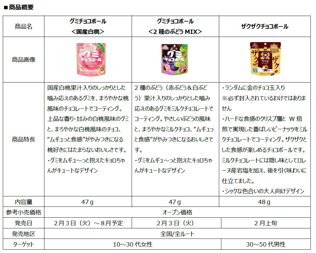 森永製菓株式会社(東京都港区芝浦、代表取締役社長 COO・森 信也)は、子どもから大人まで幅広い世代にご愛顧いただいている「チョコボール」ブランドから、グミにチョコをコーティングした「グミチョコボール<国産白桃>」「グミチョコボール<2種のぶどうMIX>」を2月3日(火)より新発売いたします。