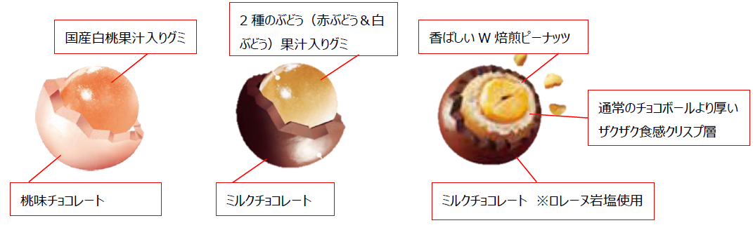 噛み応えのある果汁入りグミを相性の良いチョコレートでコーティング。フルーティなグミの味わいと噛み心地、そしてチョコレートの優しい甘さのハーモニーが、ちょっとした気分転換にぴったりの品質です。最初にチョコのパリッ、直後にグミの弾む歯ごたえ、最後にグミの果汁感が広がる“三段階の味わい”が楽しめます。