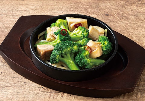 ニンニクの風味が食欲をそそる味付けの、チキンとブロッコリーのペペロンチーノ風。ジューシーなチキンと国産ブロッコリーがペペロンチーノソースと絡み合います。