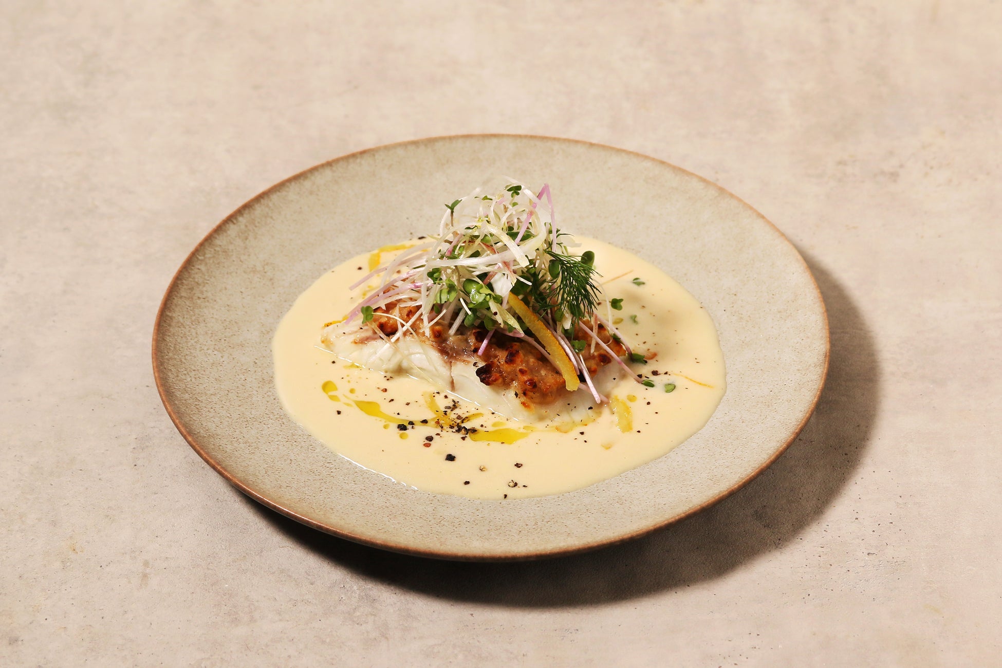 親しみのある「西京焼き」を再解釈した一皿です。柚子のさわやかなソースには、白みそを隠し味として加えました。シャキシャキとしたスプラウトとオレンジピールの存在が、この西京焼きの美味しさを引き出してくれるはずです。