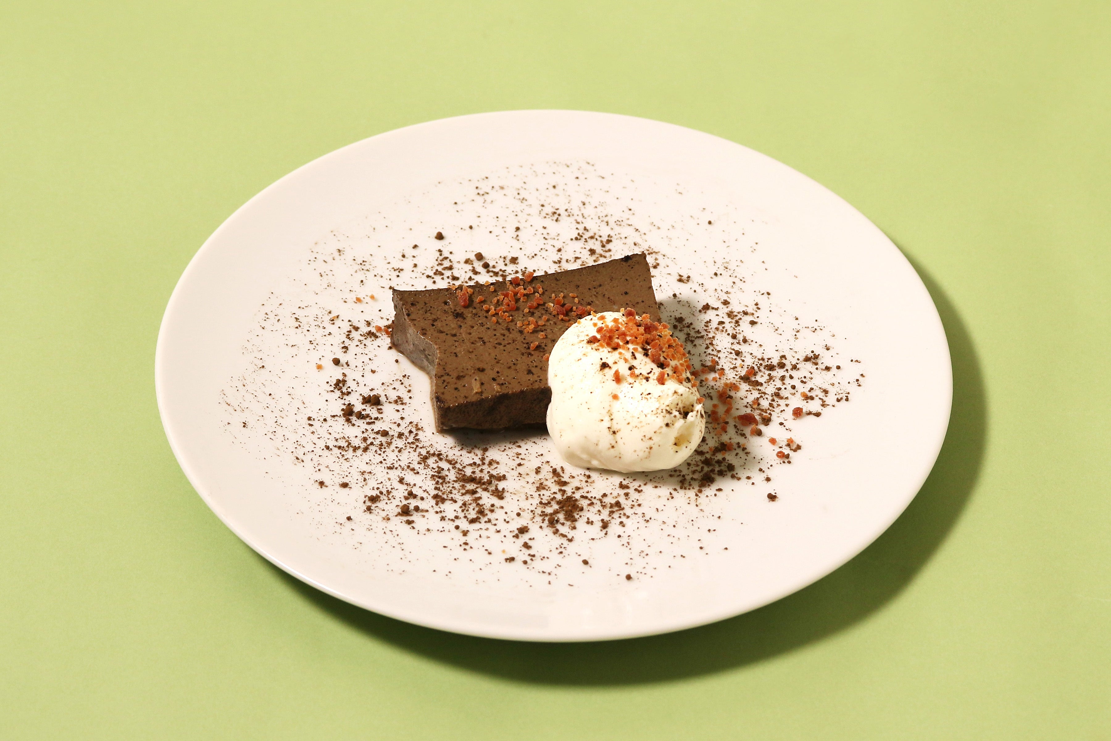 ほうじ茶を用いて和のテイストを取り入れ、固めの口あたりに仕上げました。フロマージュチーズのクリームをアクセントに添えましたので、味の変化もお楽しみいただけます。