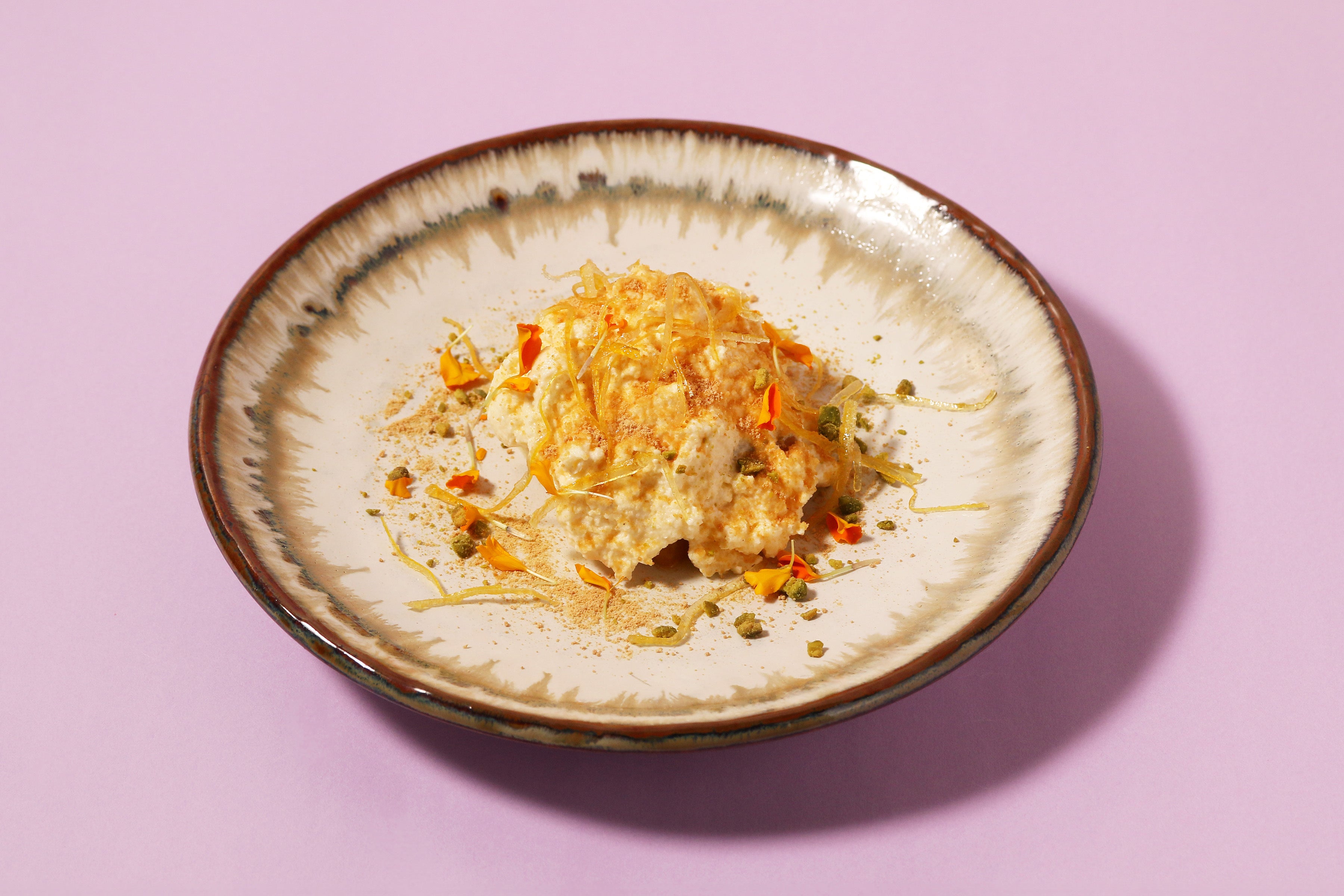 作品で表現された光の移り変わりをからすみの黄金で見立てました。ナスのソースで静けさを表現し