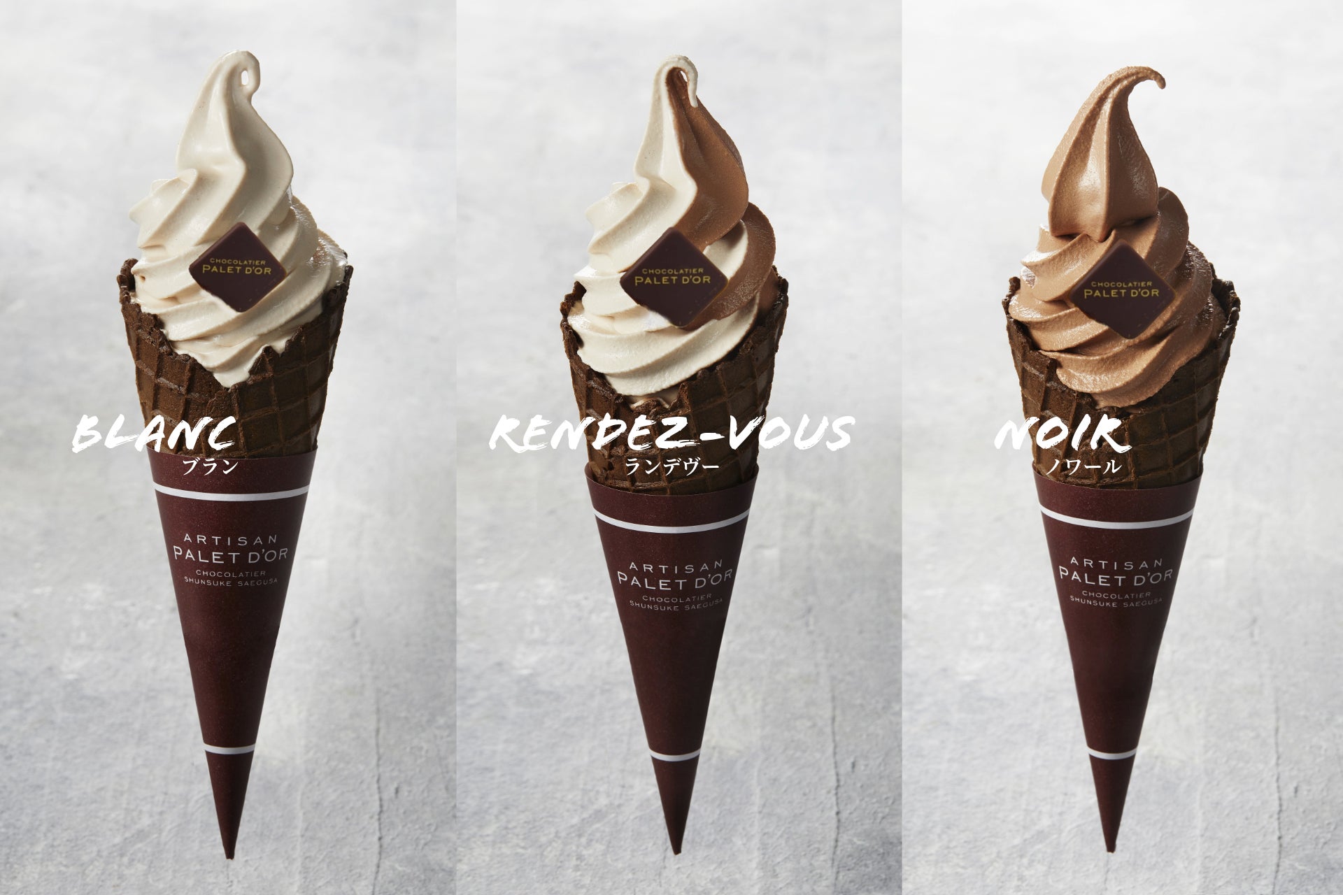 ショコラティエ パレドオールのソフトクリームは、チョコレートソフトの概念を覆す「カカオ豆」から作るもの。「ブラン」は、カカオ豆を粉砕してカカオニブにする際の、細かいカカオ粒(カカオファイン)から味と香りを抽出し、淡い白色でありながら、しっかりとカカオの味わいを感じられる他にはないソフトクリーム。