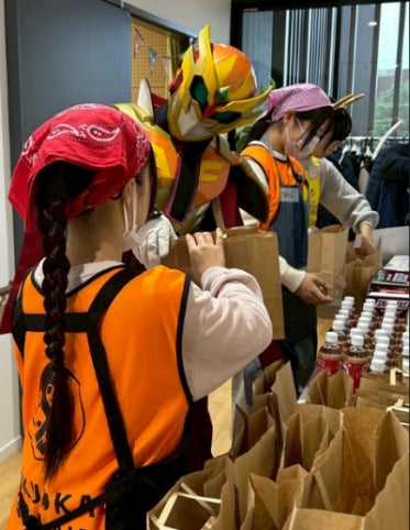 また、翌日21日に開催された子ども食堂「みなっち食堂」の参加者約80世帯にも配布。配布現場には「フクオカリバー」が登場し、子どもたちはヒーローから直接食料を受け取り、ヒーローとのふれあいに多くの子どもたちが笑顔を見せました。