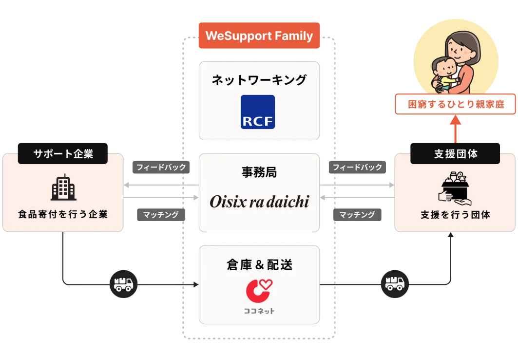 「WeSupport Family」とは、オイシックス・ラ・大地が運営しており、困窮するひとり親家庭を支援するプラットフォームです。サポート企業から提供いただいた食材や物資を、ニーズとマッチングした上で、支援団体を介して毎月ご家庭にお届けしています。サポート企業には下記のようなメリットがあり、83社(2025年6月末時点)が賛同しています。
