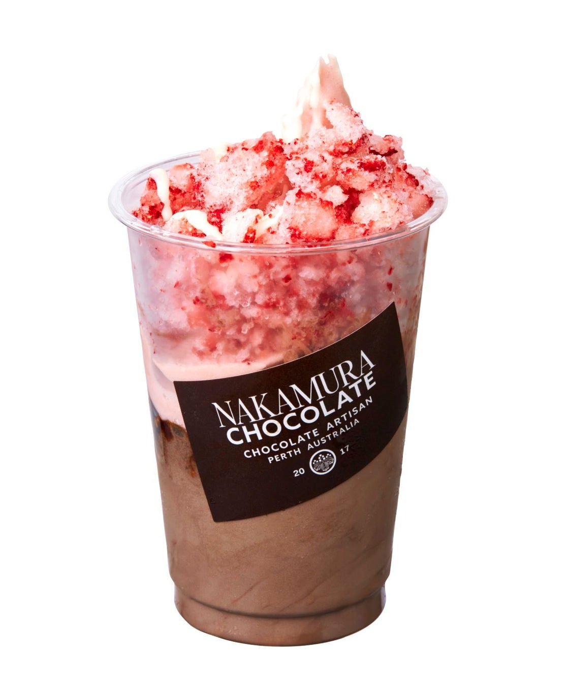 あまおうとチョコレートのソフトクリームに、いちごを丸ごと削った“いち氷®”をたっぷりトッピング。