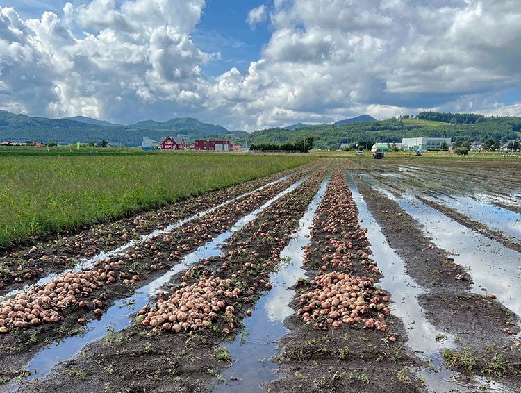 玉ねぎが大きく育つために重要な「肥大期」に記録的な猛暑と干ばつが発生。気温が40度に迫るなか降雨がなく、深刻な「小玉化」が進行。さらに8月の集中豪雨が追い打ちをかけ、収穫直前の畑が水没し多くの玉ねぎが被害を受けました。この影響により、らでぃっしゅぼーやの契約産地でも想定していた収穫量よりも約4割減少。玉ねぎMサイズ換算で35万個分にあたる70トンが収穫不能となりました。