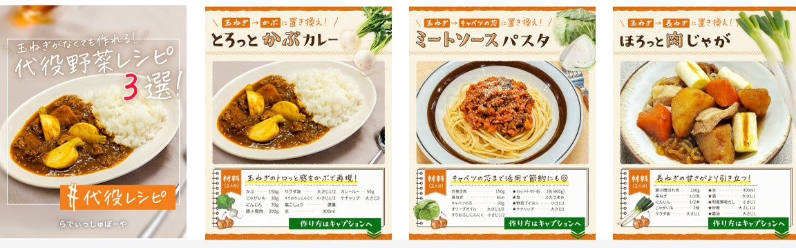 玉ねぎがご家庭内になかった場合に備え、季節野菜に置き換えたカレー、ミートソース、肉じゃが等の定番お料理レシピをらでぃっしゅぼーや公式SNSで紹介。3週にわたりInstagramにて順次公開予定です。
