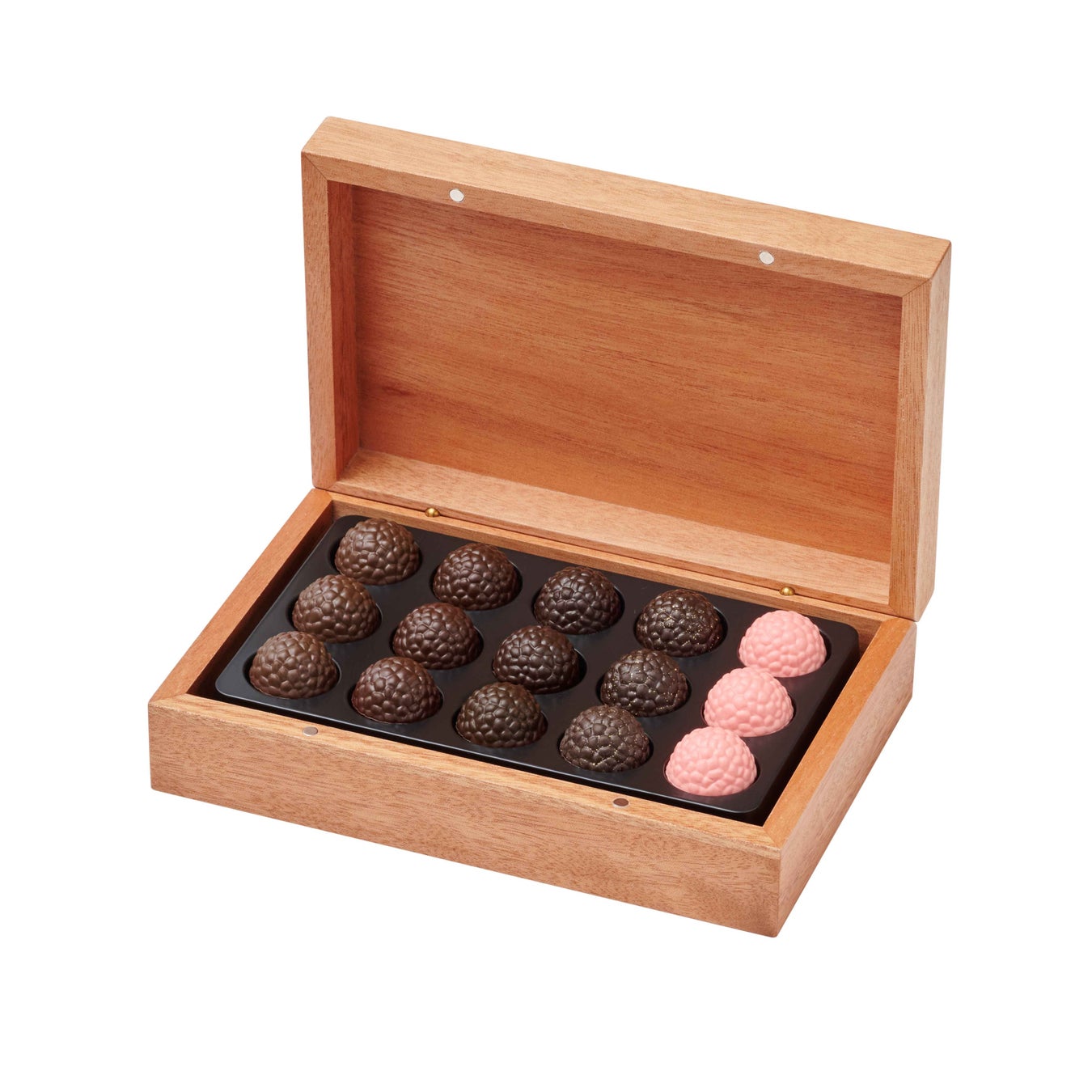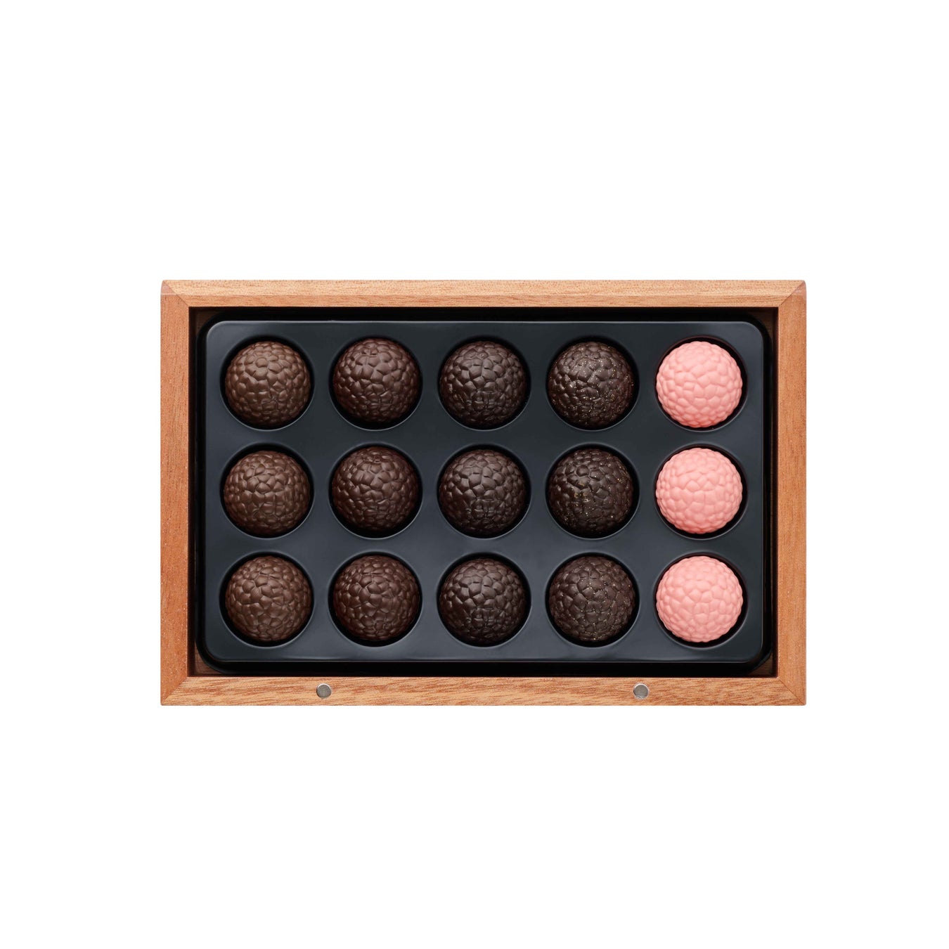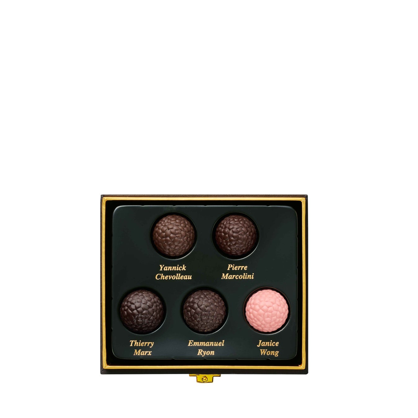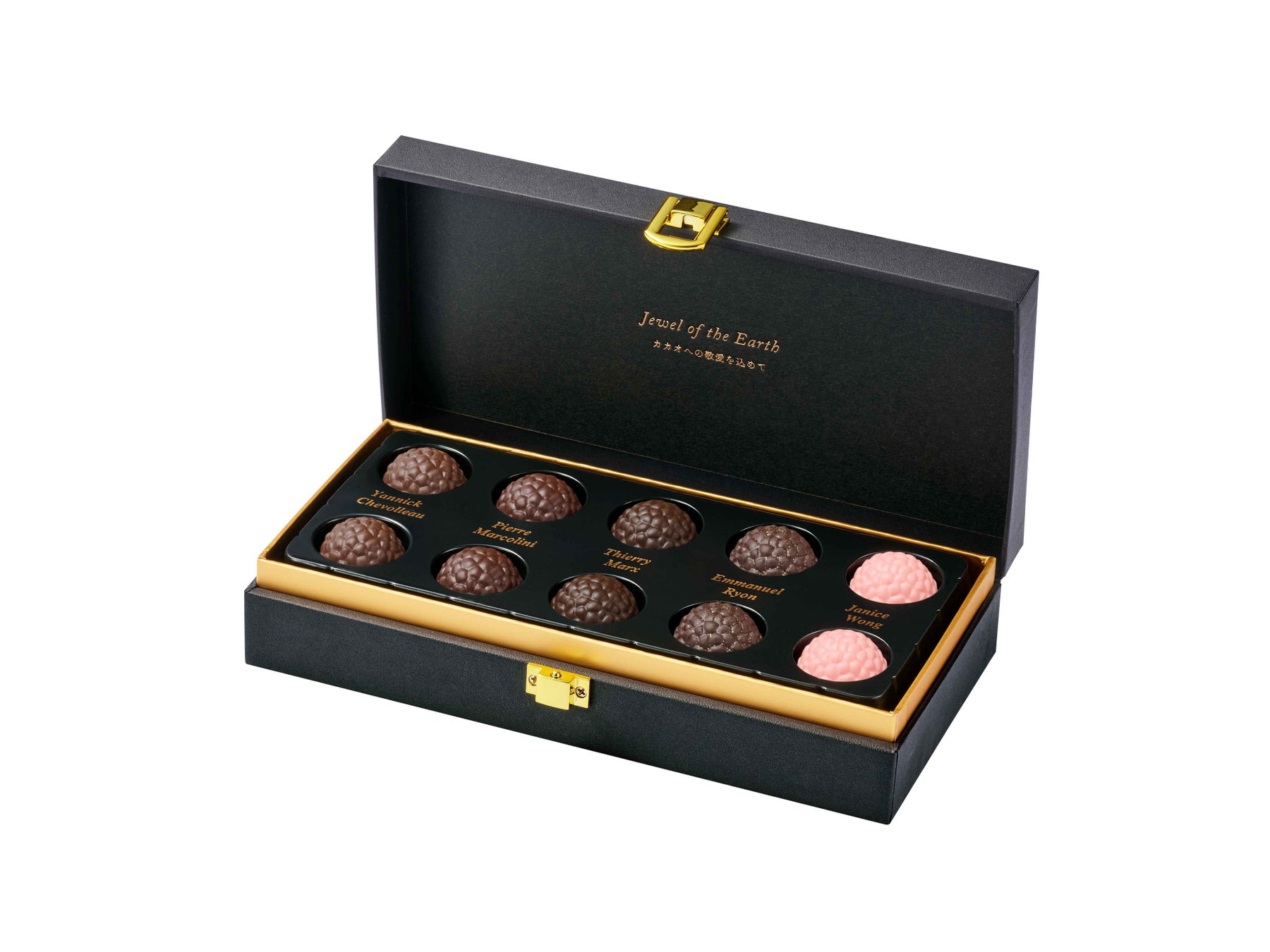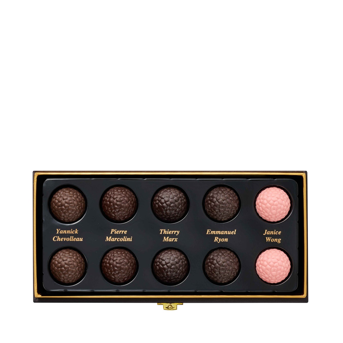 同一のフォルムでありながら、ひと粒ごとにそれぞれのスターシェフの感性輝く、カカオの深い味わい。それらを、真っ黒な黒トリュフのようなシックな箱に詰め、特別なアソートメントとしてお届けします。
