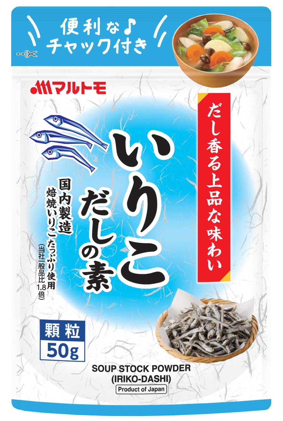 かつお節・だしと、海洋資源を通じて健康と食文化の発展に貢献するマルトモ株式会社(社長:明関眸 本社:愛媛県伊予市)は、チャック付きのスタンドタイプで保管にも便利なだしの素(計3種)を2026年3月1日より新発売します。