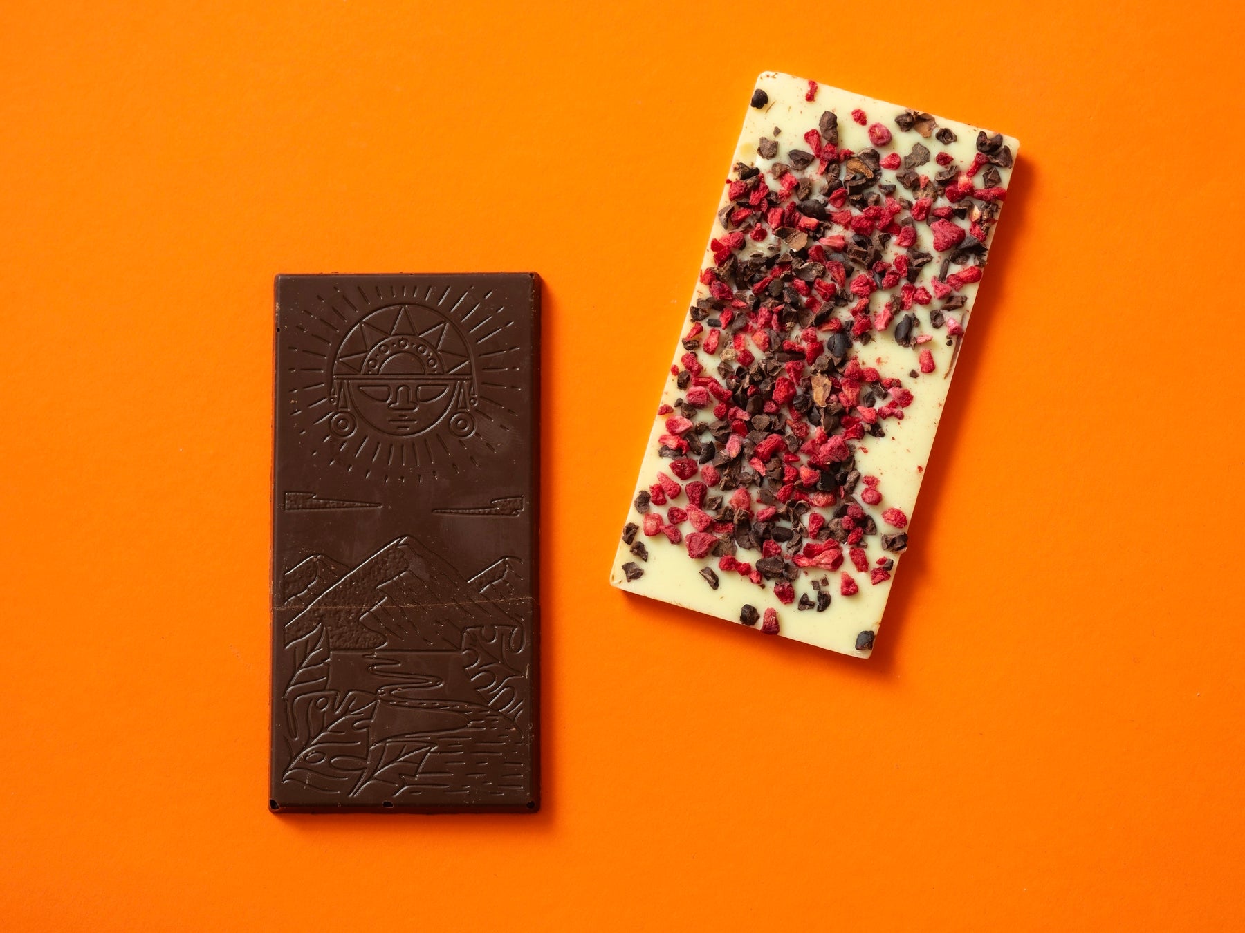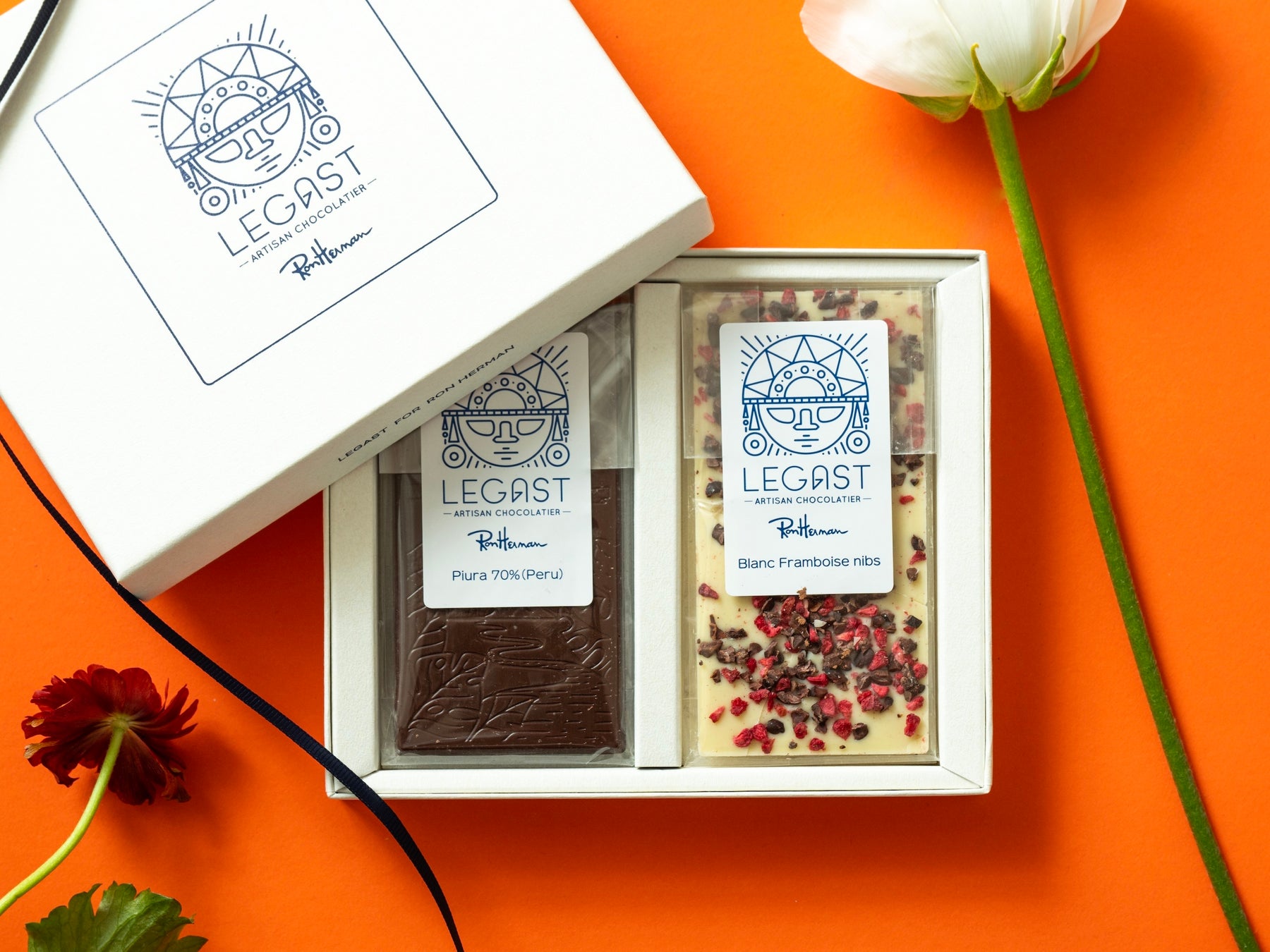 レガストの様々なフレーバーの中から、ペルー北部のピウラにて採れた希少なカカオを使用した、フルーティーな味わいの中に奥行きのある香りがひろがる「ダークチョコレート」とロンハーマン カフェのボックスでしか味わえない甘酸っぱいラズベリーとカカオニブの食感が合わさった、やさしい甘さがひろがる「ホワイトチョコレート」をご用意しました。