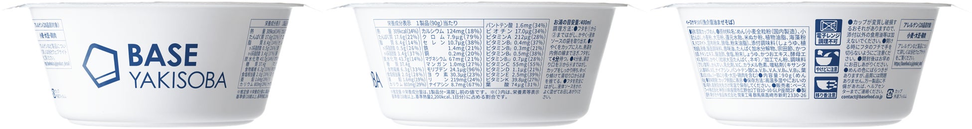 「BASE YAKISOBA 魚介醤油まぜそば」は、全粒粉をベースに主に植物由来の原材料を使用し、たんぱく質、食物繊維、ビタミン・ミネラルなど、からだに必要な33種類の栄養素を摂ることができ、たんぱく質17.6g、食物繊維6.3g、鉄1.4mg、カルシウム124mg(1個あたり)が含まれています。