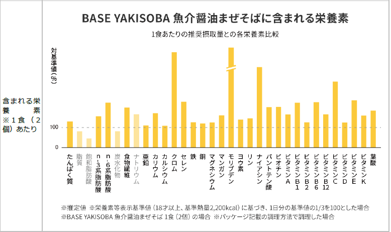 *1 1食分(BASE BREADは2袋、BASE Cookiesは4袋、BASE YAKISOBAは2個、BASE RAMENは2個、BASE Pancake Mixは1袋と卵Mサイズ1つ、牛乳(成分無調整)100mlを使用して調理した場合)で、栄養素等表示基準値に基づき、脂質・飽和脂肪酸・炭水化物・ナトリウム以外のすべての栄養素で1日分の基準値の1/3以上を含む。