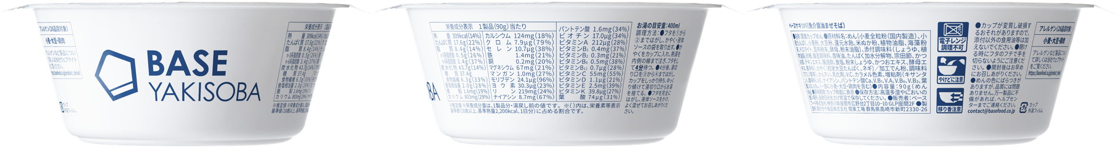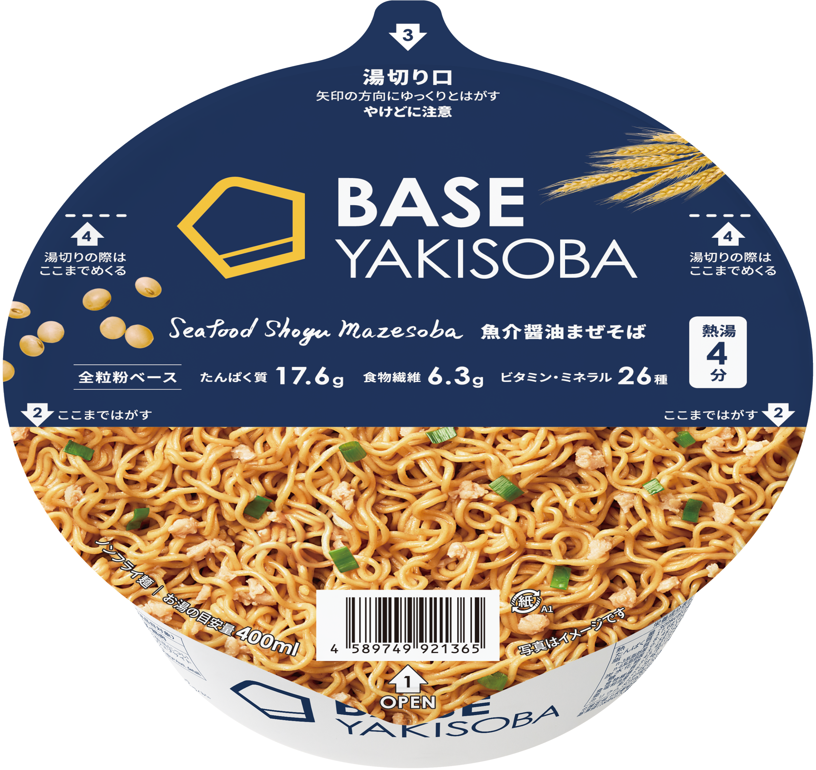 「BASE YAKISOBA 魚介醤油まぜそば」は、全粒粉をベースに主に植物由来の原材料を使用し、たんぱく質、食物繊維、ビタミン・ミネラルなど、からだに必要な33種類の栄養素を摂ることができ、たんぱく質17.6g、食物繊維6.3g、鉄1.4mg、カルシウム124mg(1個あたり)が含まれています。