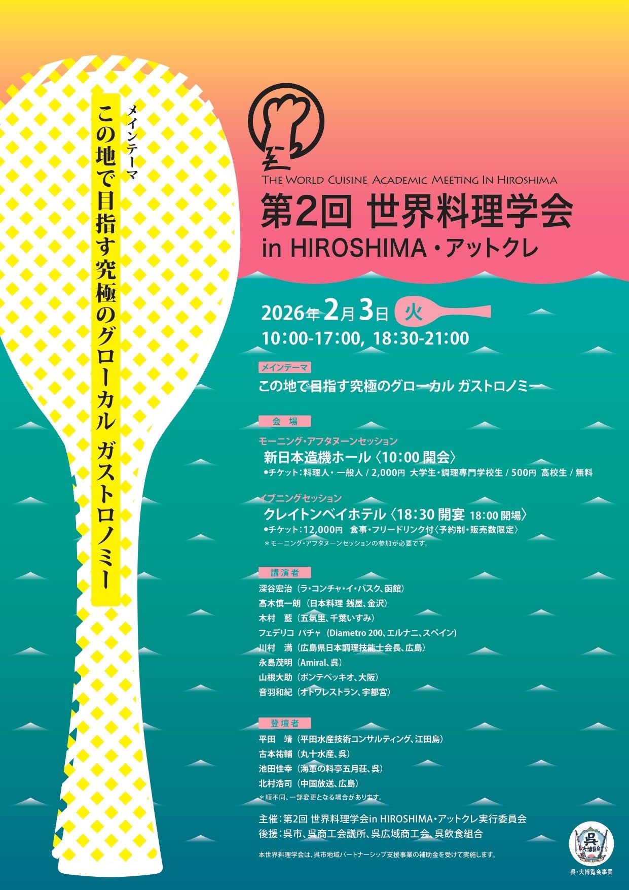 2月3日開催。メインテーマは「この地で目指す究極のグローカルガストロノミー」。若手料理人や「料理界」をめざす人、料理好きな人、生産者は学生、一般の方も参加可。