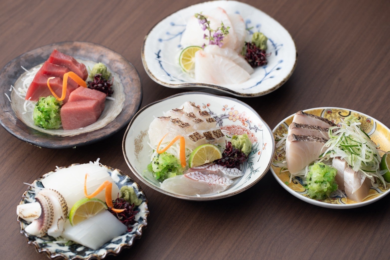 刺身・小鍋・揚げ・鮨の四種仕立てで提供します。
