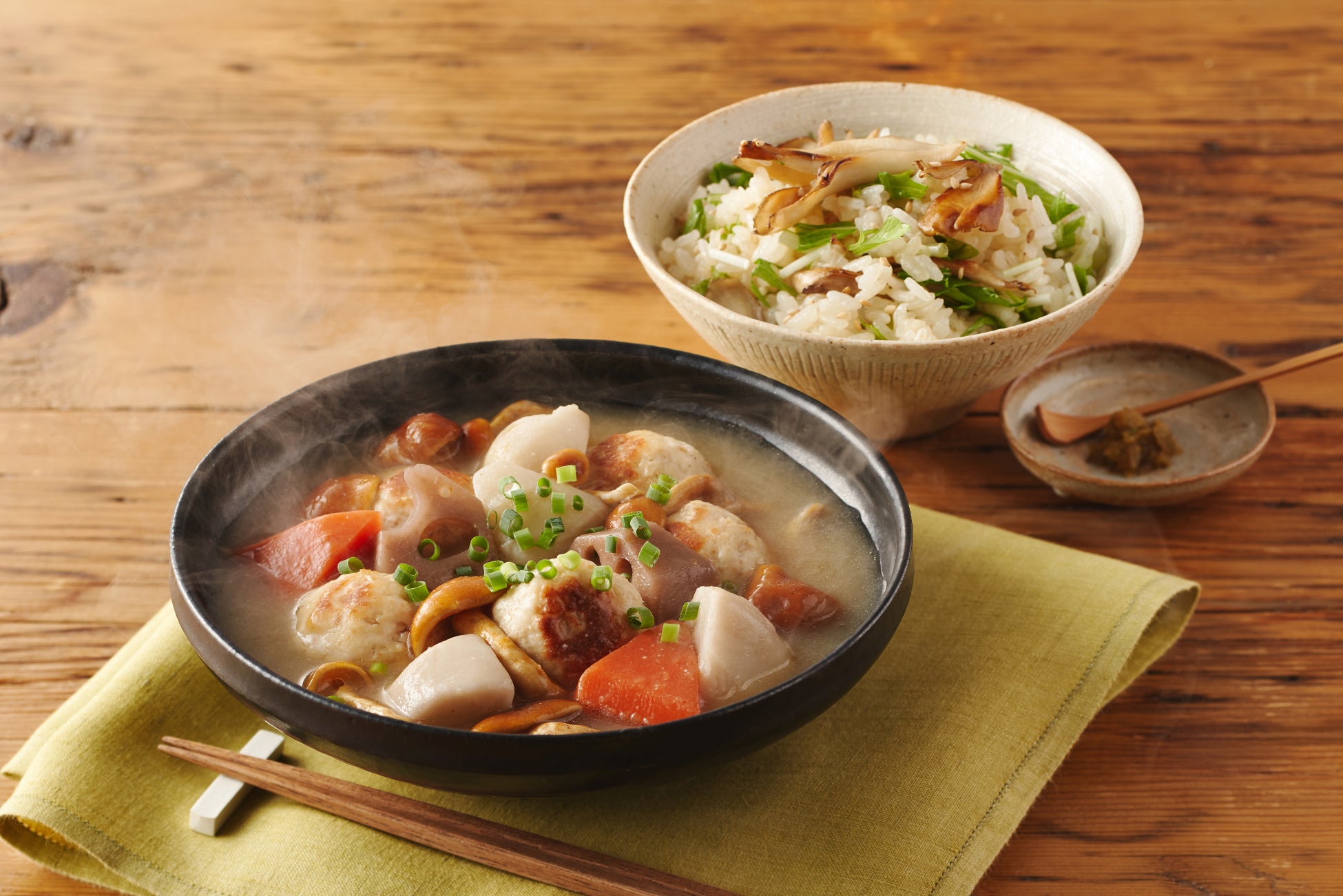 商品説明:秋田の郷土料理、芋のこ汁をアレンジ。芋のこ汁の主役であるさといもと、佐々木希さんお気に入りの足長なめこで、とろっとした優しい味わい。フレッシュな水菜とマイタケの風味とがクセになる混ぜごはんと合わせて、忙しい日にも嬉しい献立です。