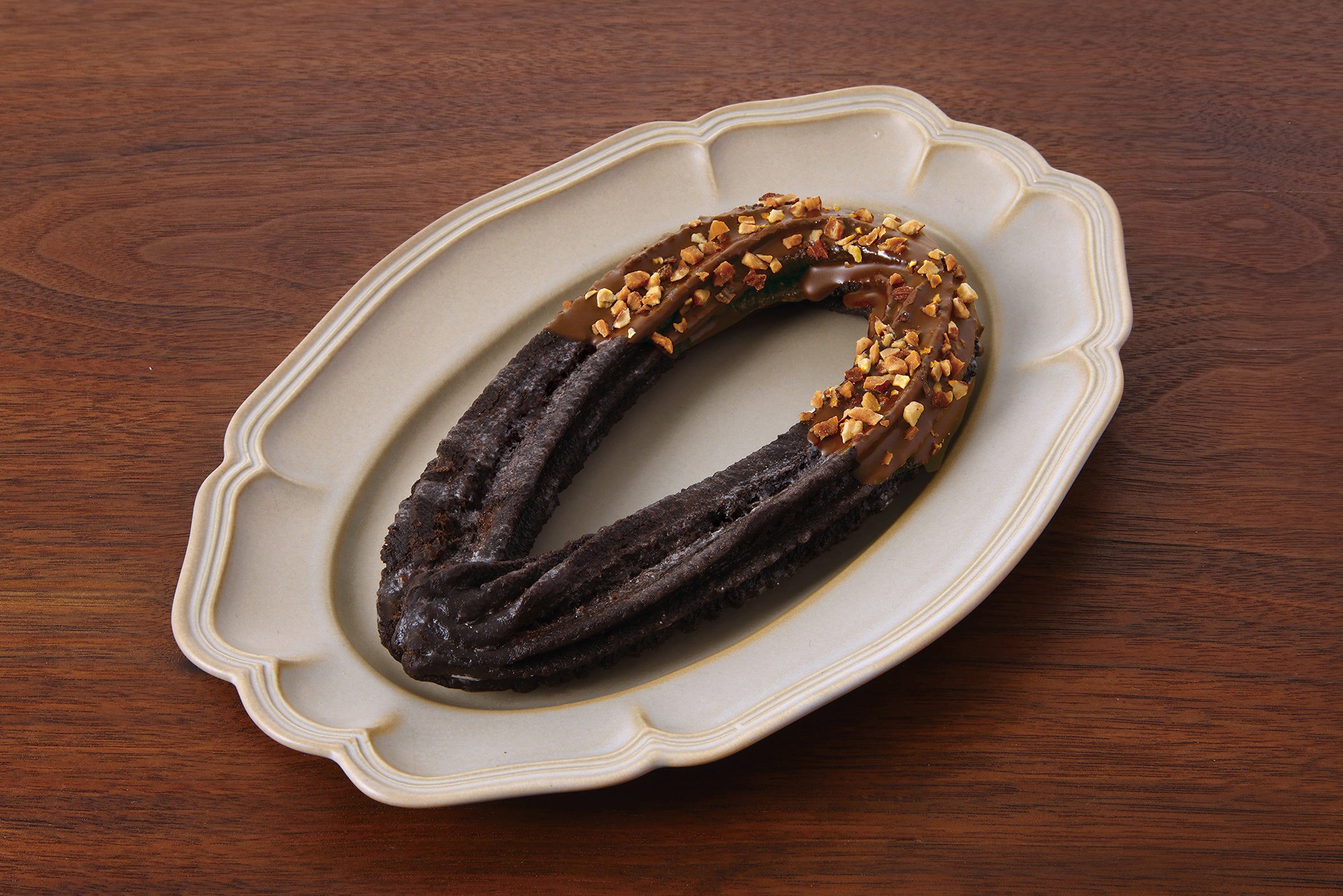 ブラックココアを使用したチョコ味のチュロッキーにビターチョコをかけ、アーモンドクランチをトッピングしました。アーモンドクランチがアクセントになり、様々な食感が楽しめます。