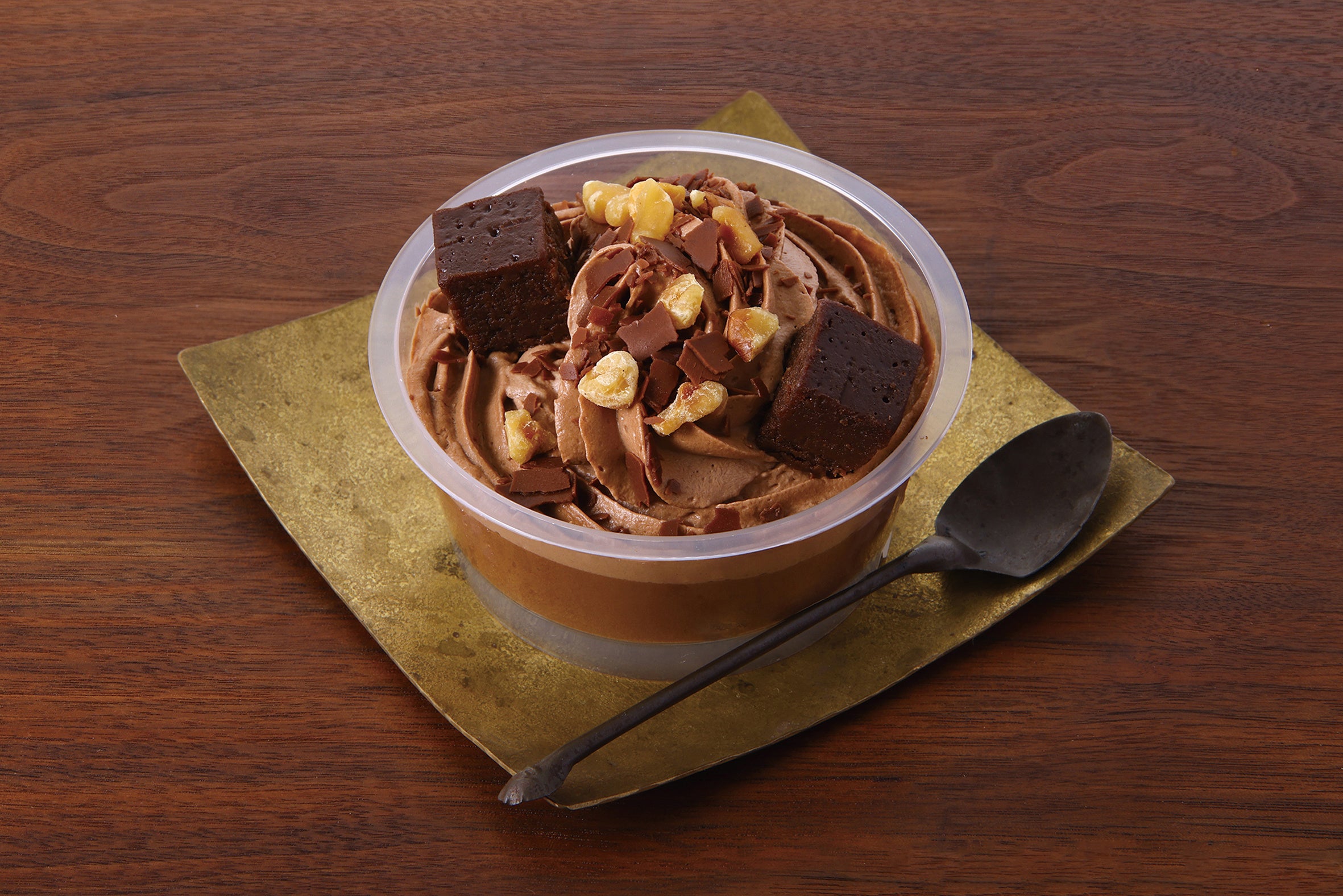 ベルギーチョコ使用。ココアスポンジ、チョコムースにチョコホイップを絞りました。トッピングにはくるみとガトーショコラ生地をのせたショコラパフェです。