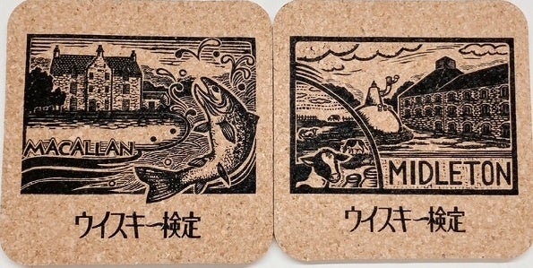 ウイスキー検定では、毎回、クリアファイルやコースター、ノートなど、より一層ウイスキーを楽しんでいただけるグッズを受験者特典として用意しています。今回はコルク素材を使用した、環境にも優しいコースターです。図柄は、版画家・渡辺トモコさんが手掛けたスコットランドのマッカラン蒸留所とアイルランドのミドルトン蒸留所。マッカラン蒸留所にはその象徴でもある18世紀のイースターエルヒーズ館という領主の館とスペイ川のサーモンが、ミドルトン蒸留所には、かつて世界最大を誇ったポットスチルが稼働していた旧ミドルトン蒸留所と近隣に広がる田園地帯が描かれています。コースターは2月に発送される受験キット(問題、解答用紙)と一緒に送付されます。ランダムでのプレゼントとなりますので、どちらのデザインが届くかは受け取ってからのお楽しみです。