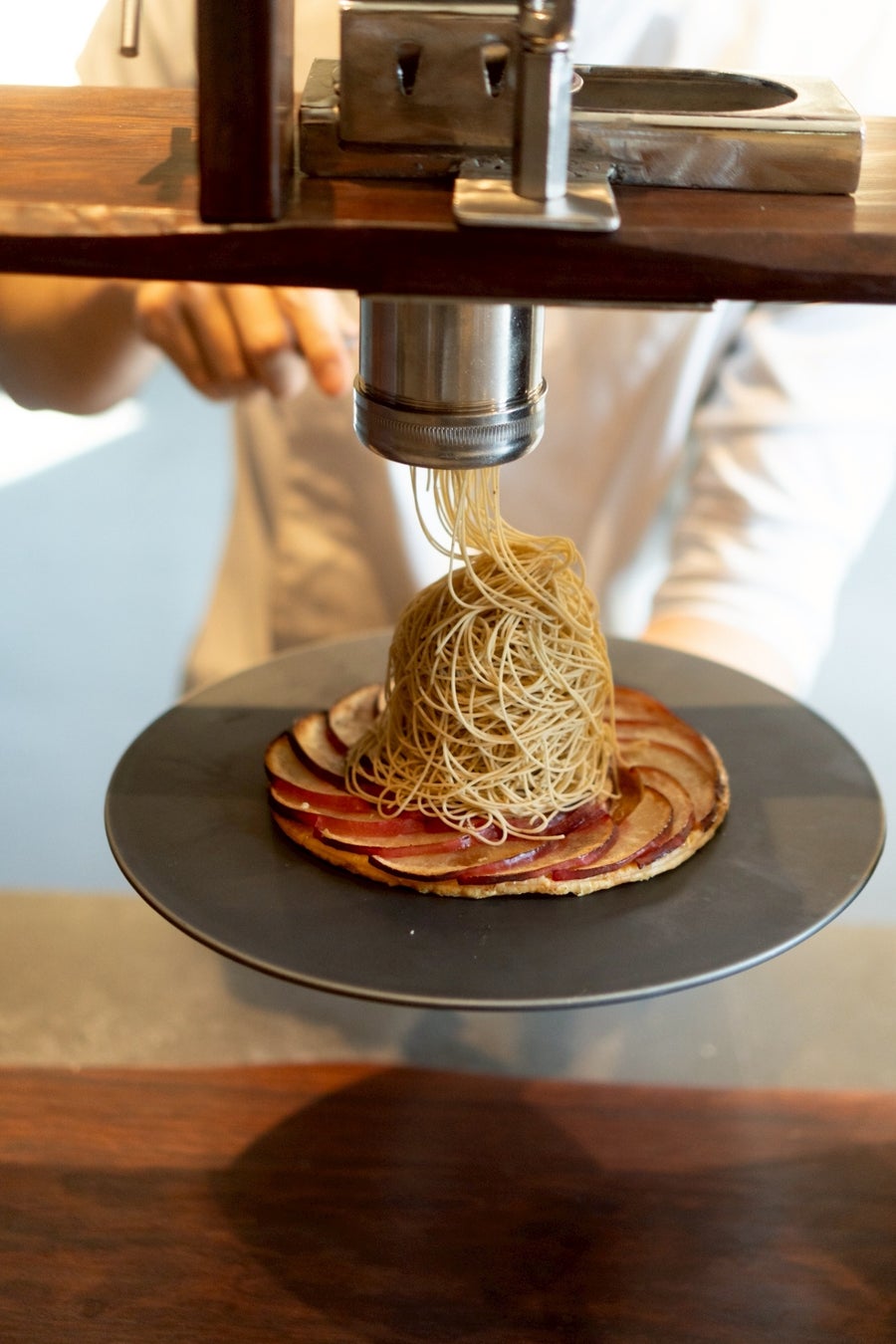 オリジナルの搾り機から1mmの細さで紡ぎ出した和栗を織り重ねて作る、こだわりの逸品です。
