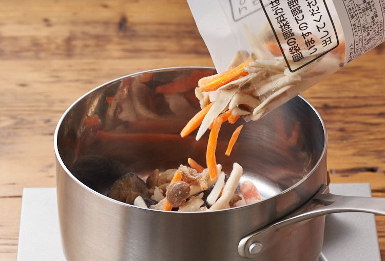 概要:6種類の野菜ときのこ、豚肉、味噌がセットになっている商品です。 具材は360gとたっぷり入っており、きのこの旨みや野菜からでるやさしい味わいを楽しめます。味噌にはだしが入っているので、冷凍のまま具材を炒めてお湯を入れ、セットの味噌を溶かすだけでかんたんにお召し上がりいただけます。 お好みでご家庭のお豆腐や薬味ねぎ、ごま油を加えるのもおすすめです。揚げなすでよりコクをだし、なめこが食感のアクセントになっています。 麦味噌、米味噌、豆味噌の3種類の味噌を使用し、濃厚な旨味を感じるスープに仕上げています。