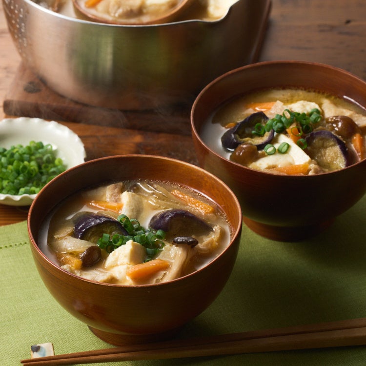 概要:6種類の野菜ときのこ、豚肉、味噌がセットになっている商品です。 具材は360gとたっぷり入っており、きのこの旨みや野菜からでるやさしい味わいを楽しめます。味噌にはだしが入っているので、冷凍のまま具材を炒めてお湯を入れ、セットの味噌を溶かすだけでかんたんにお召し上がりいただけます。 お好みでご家庭のお豆腐や薬味ねぎ、ごま油を加えるのもおすすめです。揚げなすでよりコクをだし、なめこが食感のアクセントになっています。 麦味噌、米味噌、豆味噌の3種類の味噌を使用し、濃厚な旨味を感じるスープに仕上げています。