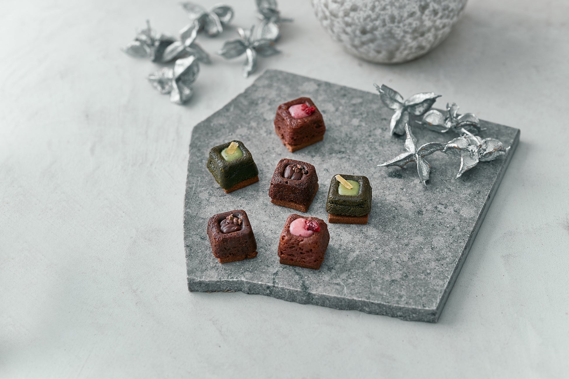 ガナッシュ、生地、サブレの独自の三層構造に、フレーバーごとに異なるトッピング素材を重ねることで、ひとくちごとに食感・香り・味わいが段階的に広がる設計に仕立てました。