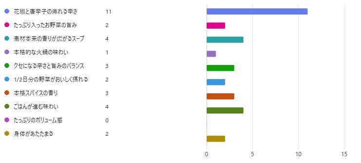 調査結果によると、最もおすすめのポイントは「花椒と唐辛子の痺れる辛さ」でした。店長のコメントでも「辛さが得意な方におすすめ」といった声が多く、しっかりとした辛さを楽しめる商品であることがうかがえます。