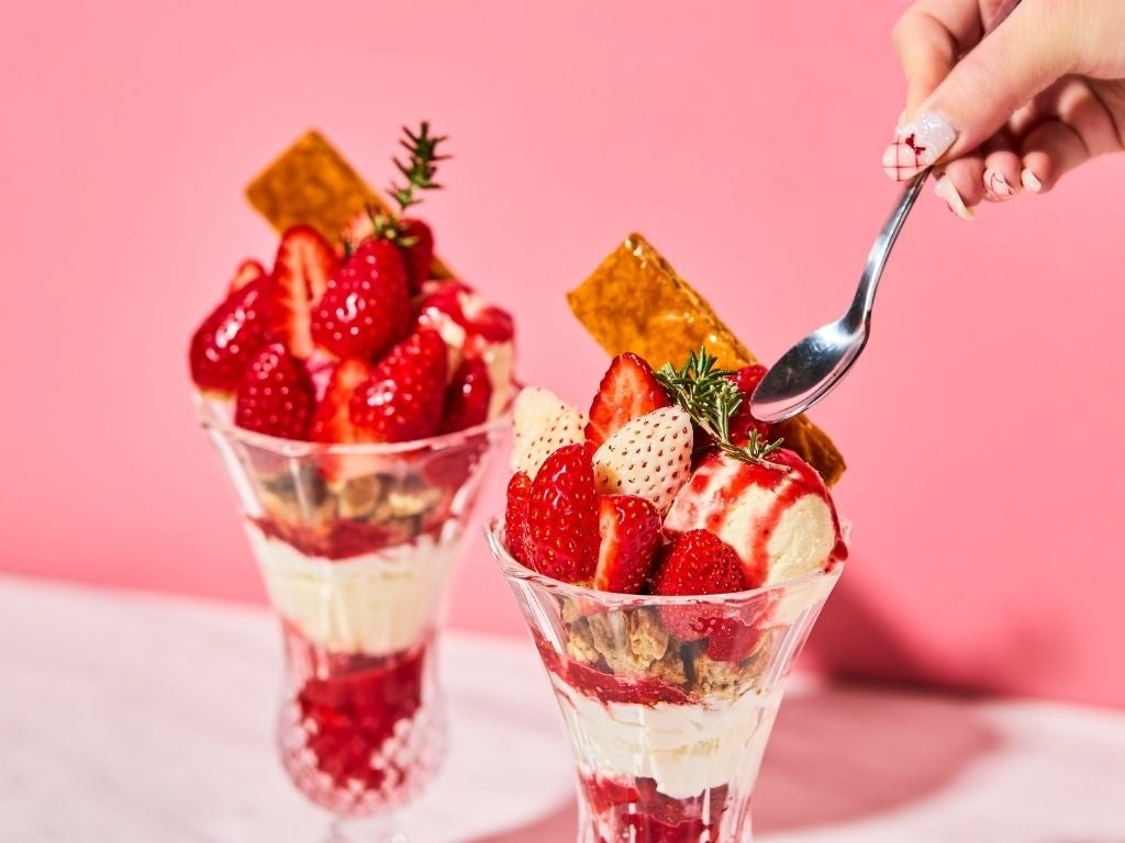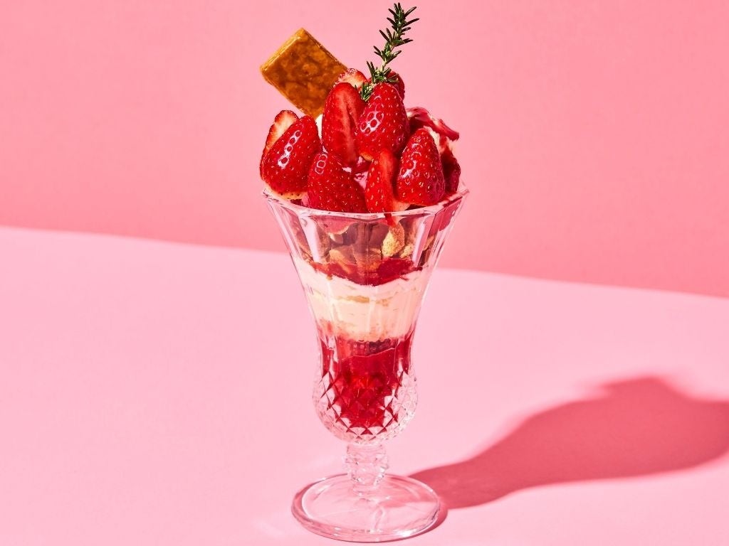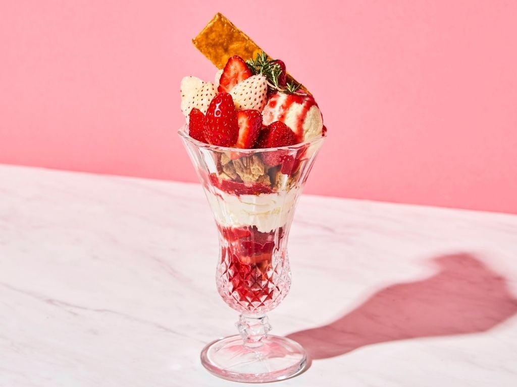 苺・カシス・フランボワーズの3種のベリーが織りなす甘酸っぱいハーモニーを、ミルクアイスとコクのあるマスカルポーネのやさしい甘さが包み込みます。仕上げに添えたサクサクのパイが香ばしいアクセントとなり、最後の一口まで苺の美味しさを引き立てます。