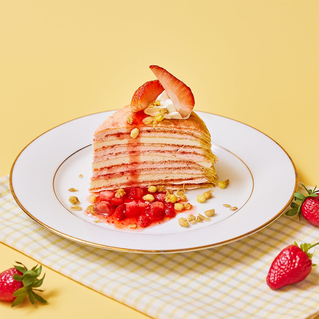 甘酸っぱいストロベリーソースとふんわりいちごのホイップクリームと爽やかなレアチーズムースを重ねた贅沢なミルクレープです。