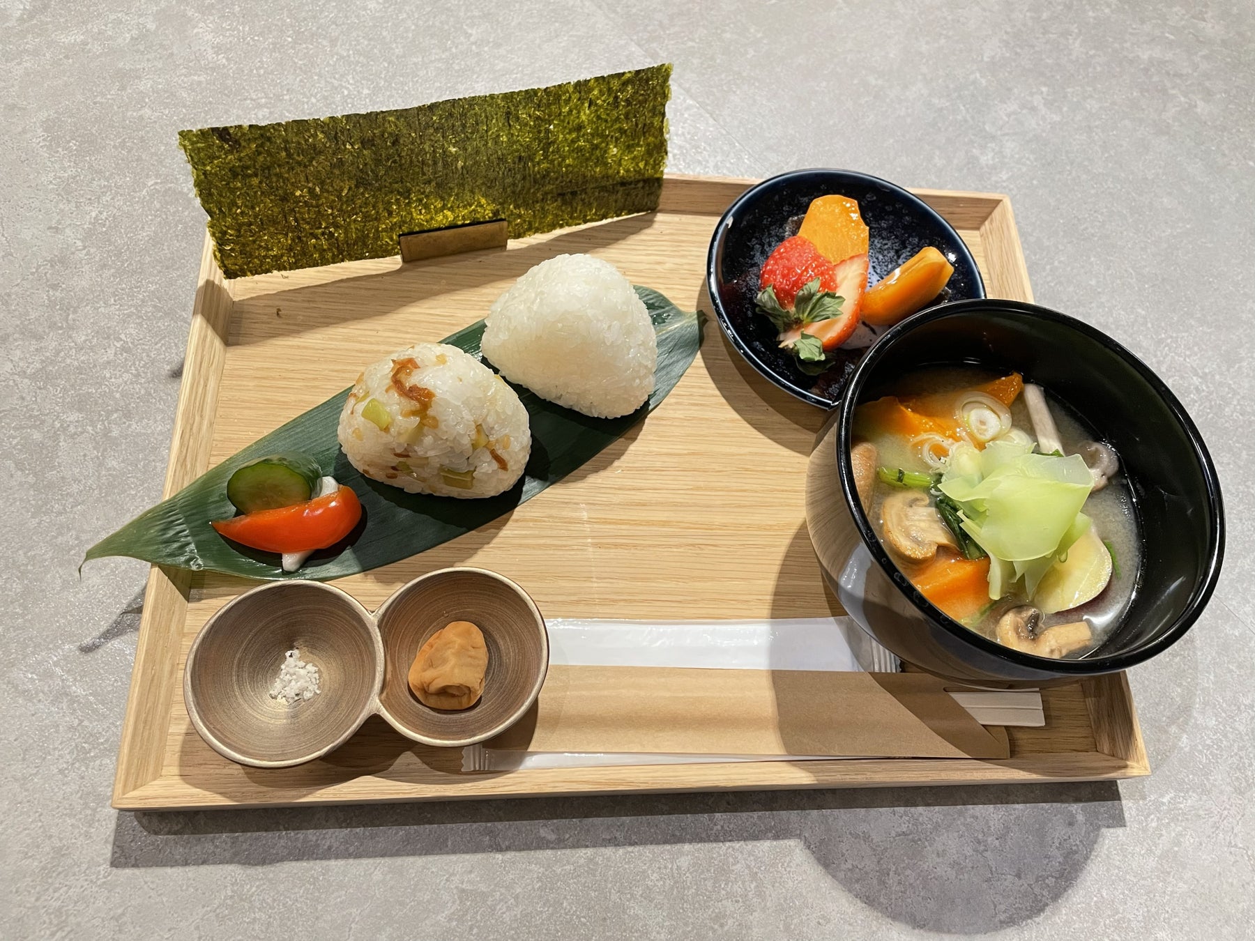 ふっくらおにぎりと野菜を食べる味噌汁セット 1200円(消費税込み)