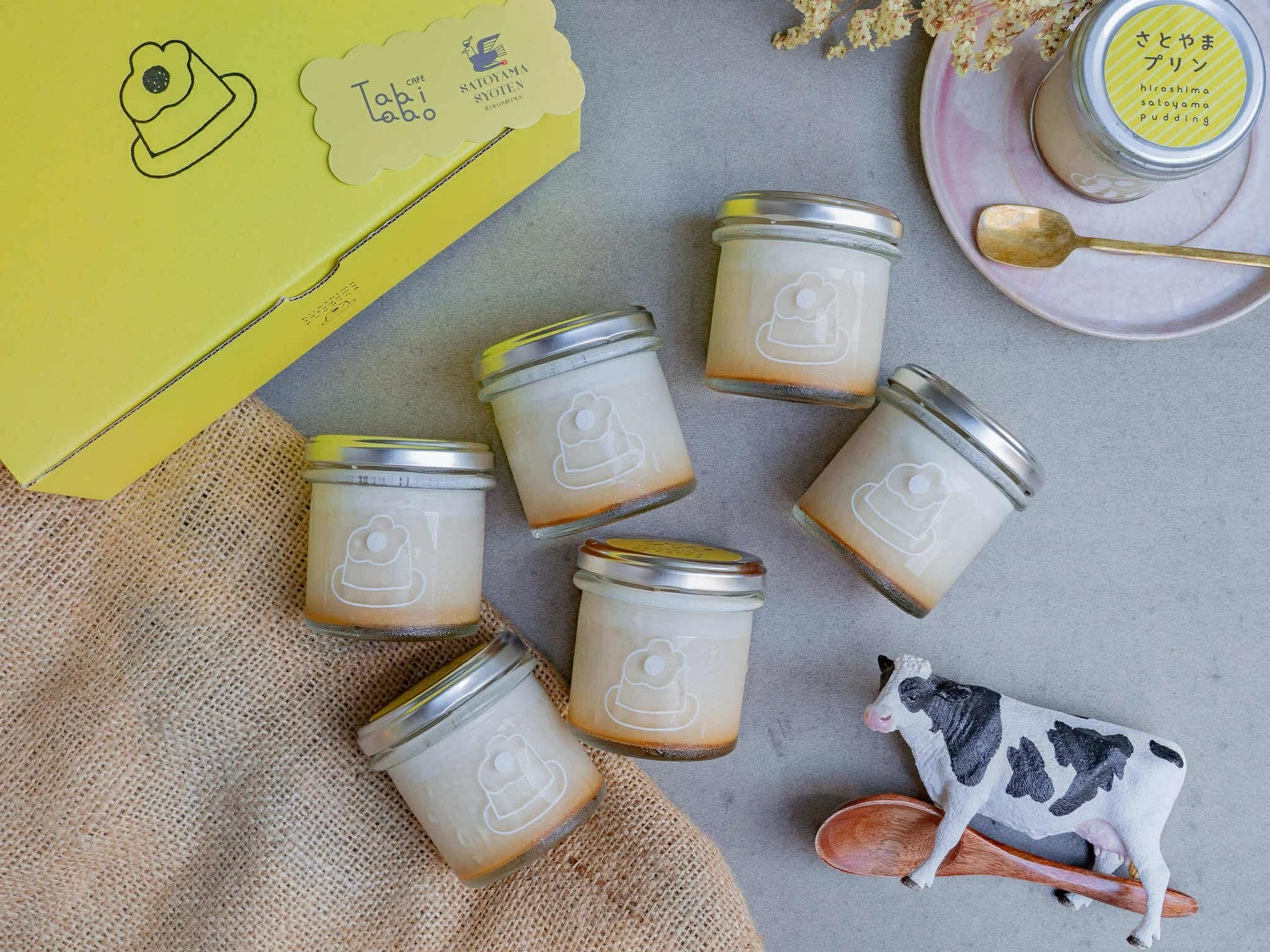 スイーツは、株式会社FRASCOが手がける広島市中区三川町の「Tabi Labo CAFE」の人気メニュー、さとやまプリンや、米粉焼きドーナツ(HANAドーナツ)が並ぶ。