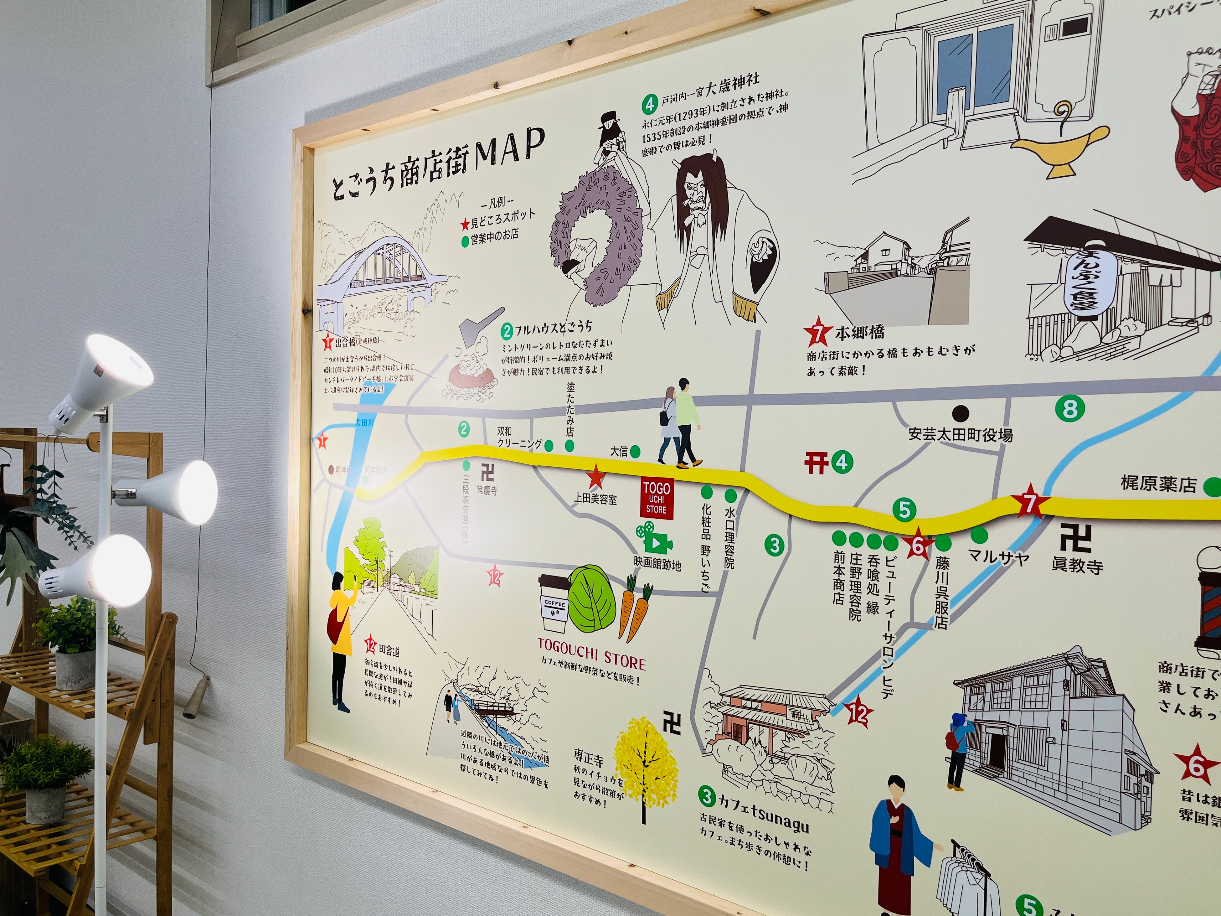 店内に設置した、とごうち商店街の地図。