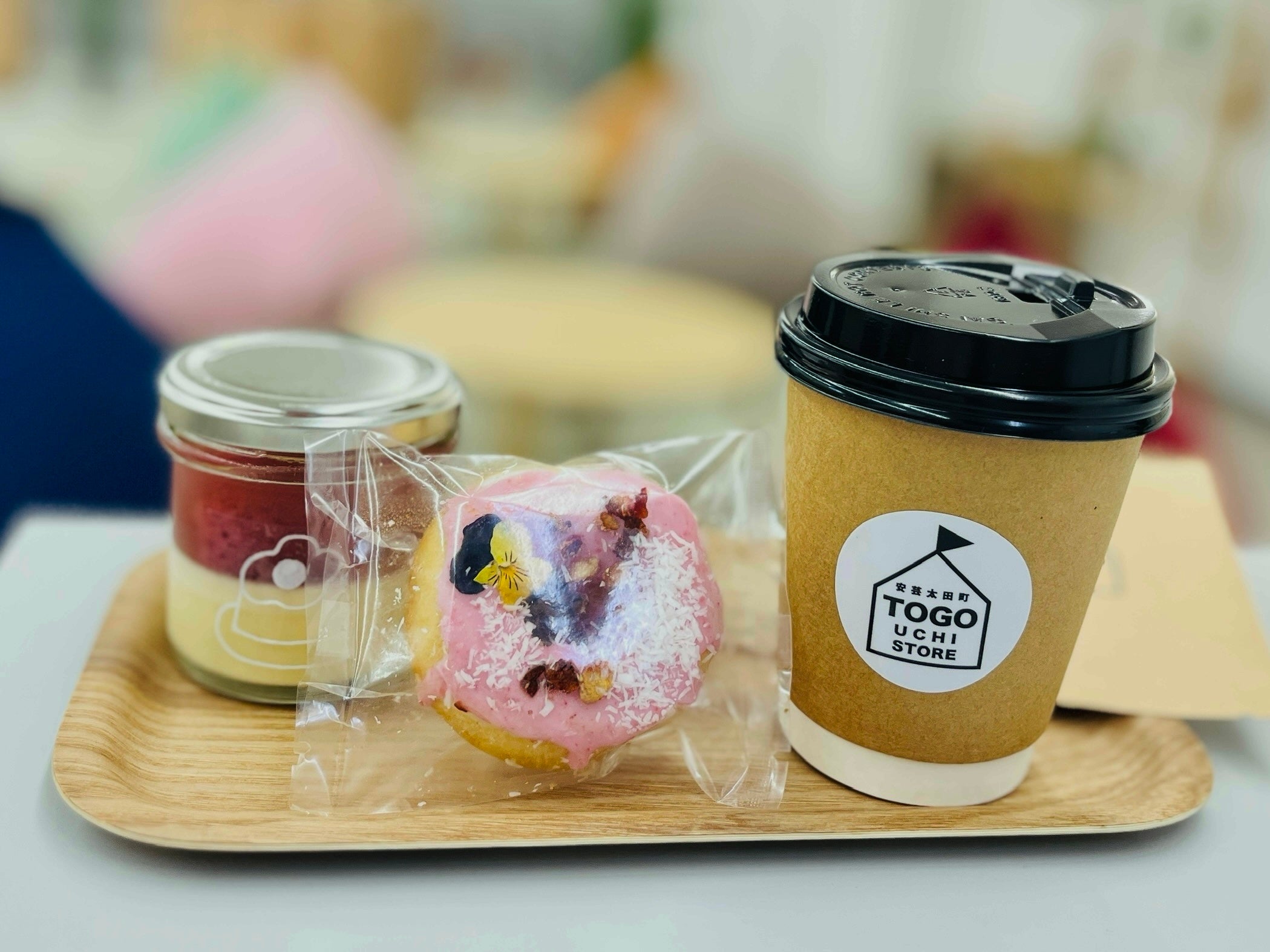 スイーツは、株式会社FRASCOが手がける広島市中区三川町の「Tabi Labo CAFE」の人気メニュー、さとやまプリンや、米粉焼きドーナツ(HANAドーナツ)が並ぶ。