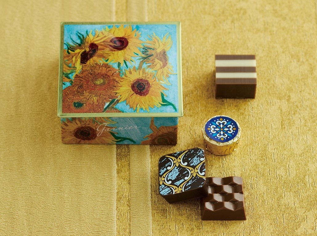世界的に有名なフィンセント・ファン・ゴッホ作、「ひまわり」の名画をあしらったデザイン缶に、ひとつひとつ丁寧に仕上げた4種類のチョコレートを詰め合わせた「ガルニエ B」が登場。