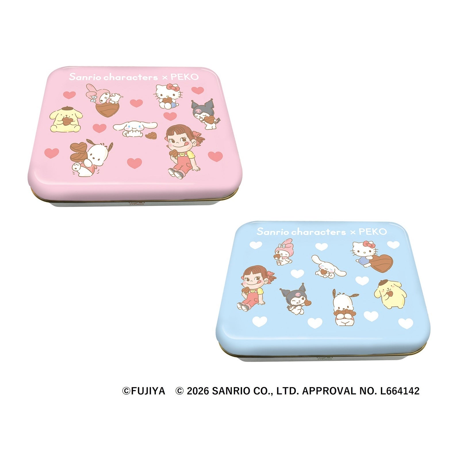 「サンリオキャラクターズ×ペコ コラボギフト缶(ピンク/ブルー)」 各税込880円