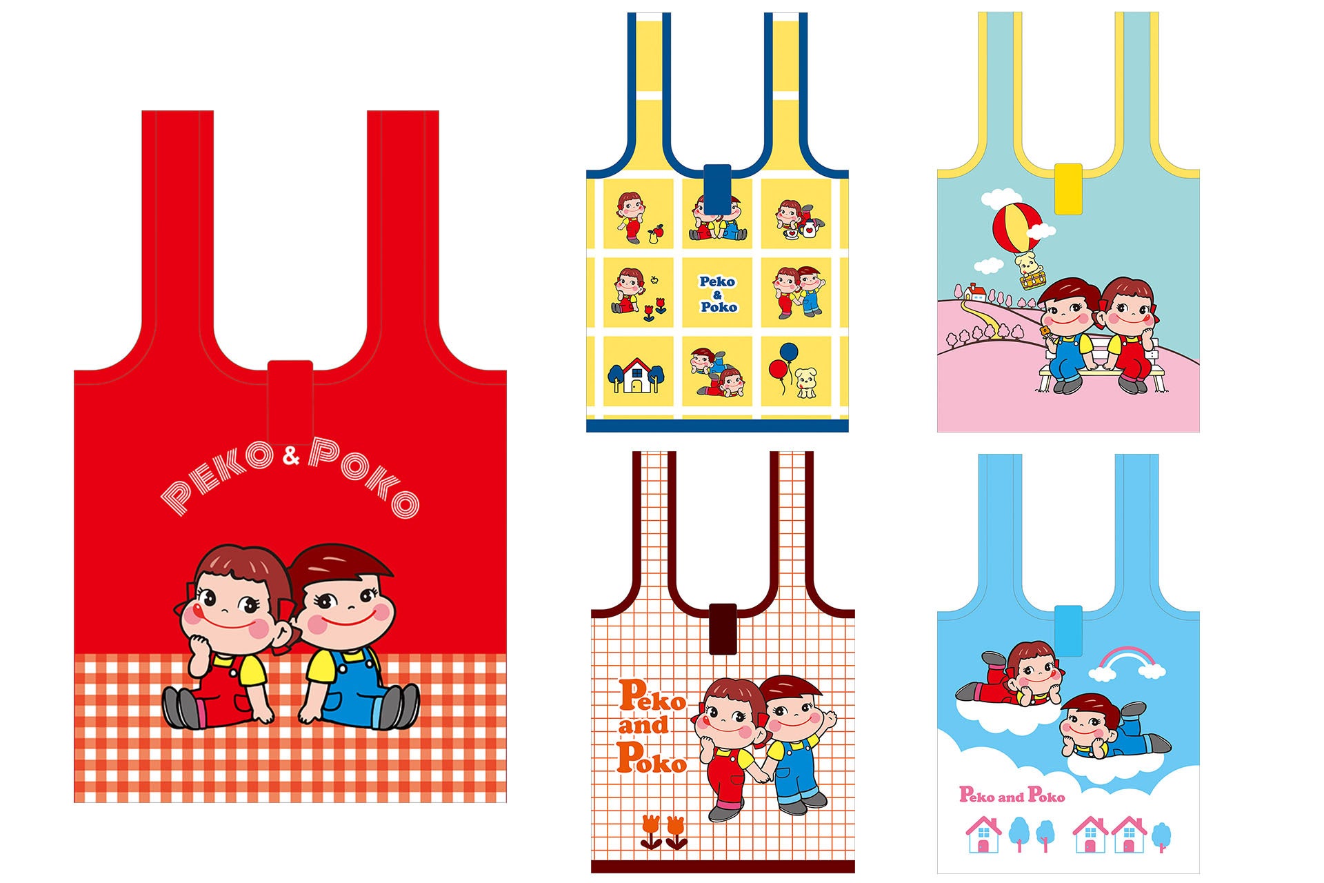 ペコちゃんとポコちゃんのニューレトロなデザインがかわいいエコバッグです。バッグをまとめられるゴムバンド付き。全5種ランダムで、どれが出るかはお楽しみ!