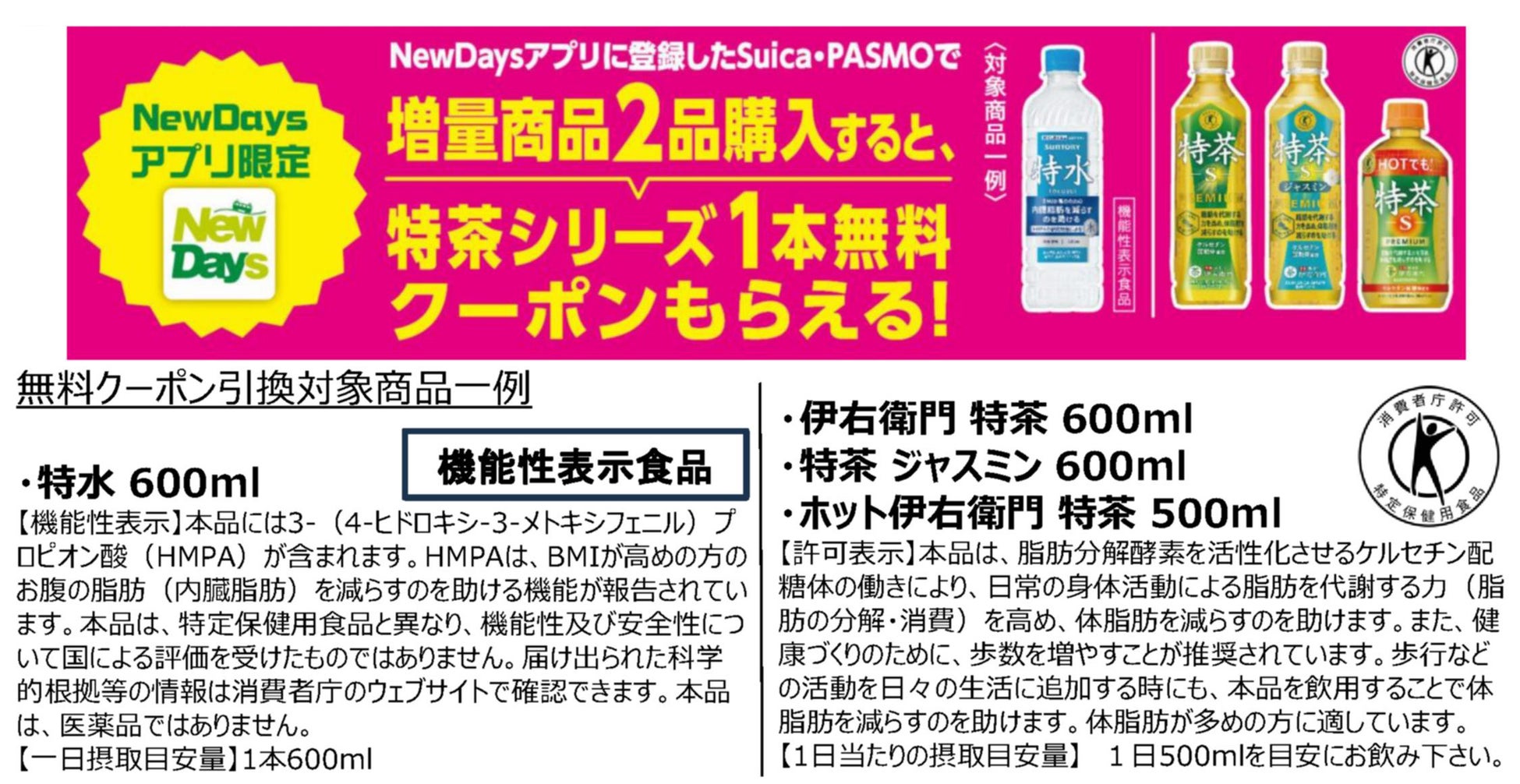 増量フェス期間中、事前にNewDaysアプリに登録したSuica・PASMOで増量商品を2品ご購入いただいたお客さまに、特茶シリーズ1本無料クーポンをプレゼント!