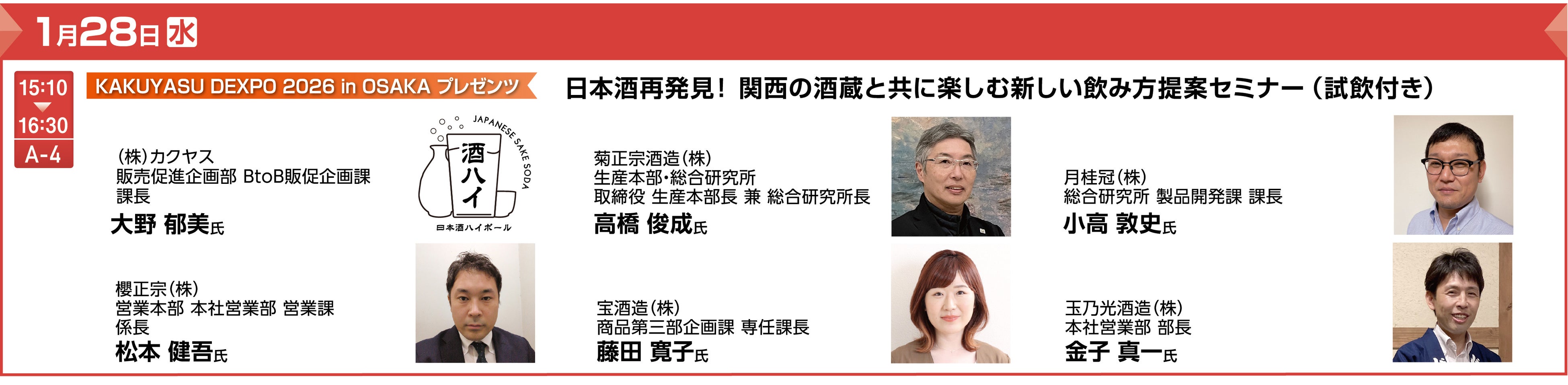 「KAKUYASU DEXPO 2026 in OSAKA」では全国各地の酒類メーカー・飲料メーカー・インポーターなど総勢80社以上が出展し、幅広い商品を取り揃えます。また、1月28日には本イベントにおいて、当社および5つの酒蔵の担当者が登壇し、日本酒を炭酸で割る新提案「酒ハイ」の魅力を紹介するセミナーを開催します。爽快感と食中酒としての飲みやすさを兼ね備えた新スタイルは、若年層や日本酒初心者のお客様からも支持を集めており、 飲食店にとっても新たな販売機会を生み出す選択肢として注目されています。