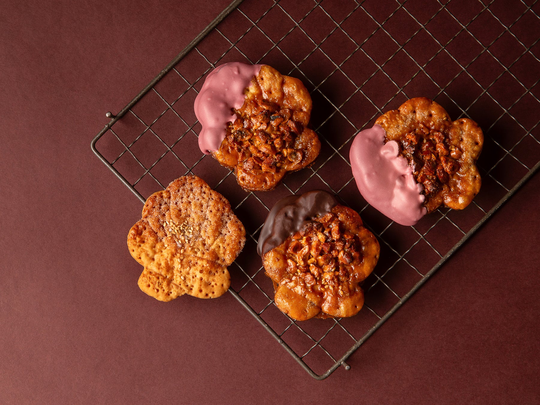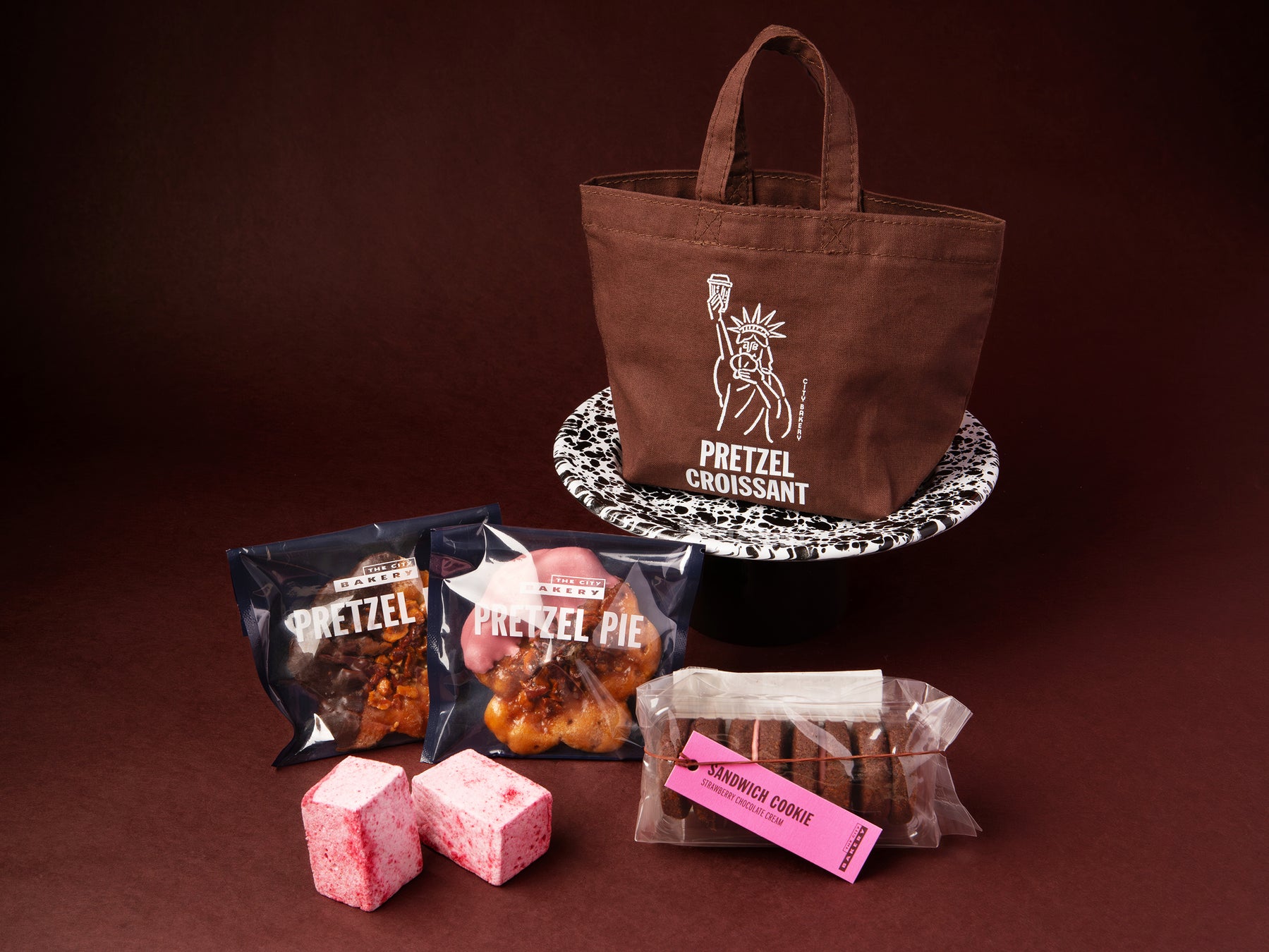 <内容>プレッツェルパイ/キャラメルナッツチョコ×1個、ピーカンナッツ&ストロベリーチョコ×1個・クッキーサンド ストロベリーチョコレート×1個・自家製ラズベリーマシュマロ×2個
