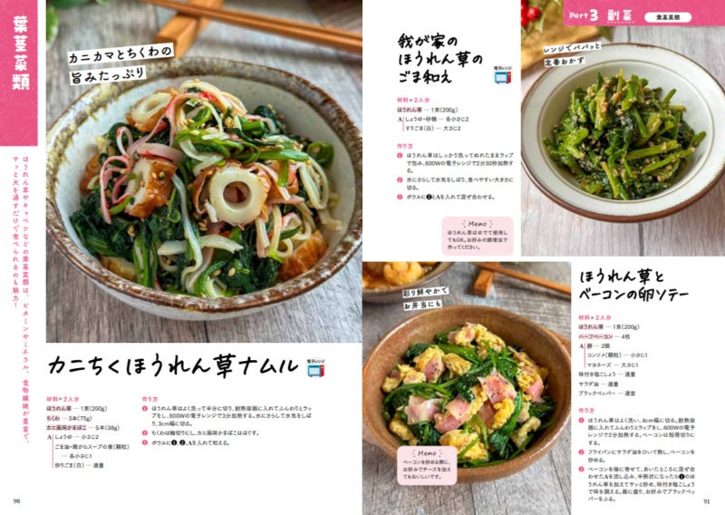 掲載レシピはメイン食材別に分類されているため、冷蔵庫の在庫から献立を考えることができます。ワンパンや電子レンジでパパッと作れるシンプルな調理法が豊富で、野菜を美味しく食べるアイデアや余りがちな食材の活用法、さらにはおもてなしにぴったりの華やかなメニューまで、幅広いラインナップが魅力です。