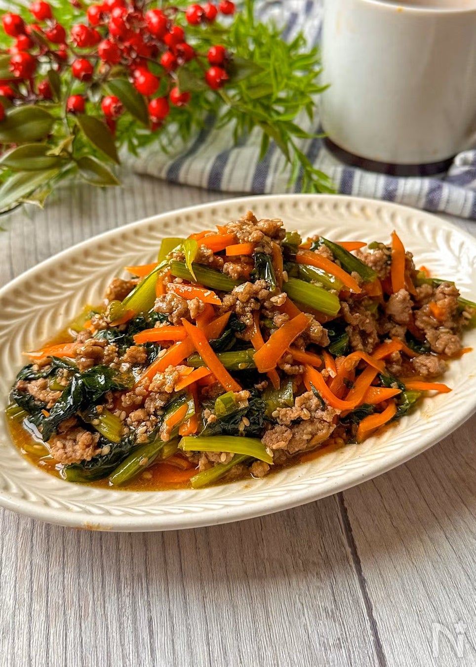 小松菜をたっぷり消費できる、栄養満点な一品です。豚ひき肉のコクにオイスターソースのうま味が加わり、野菜が苦手な方でもパクパク食べられる味付けに。ふたをして蒸し焼きにすることで、にんじんの甘みが引き立ち、短時間で味がしっかり染み込みます。多めに作って冷凍保存しておけば、お弁当の隙間埋めにも大活躍すること間違いなしです。